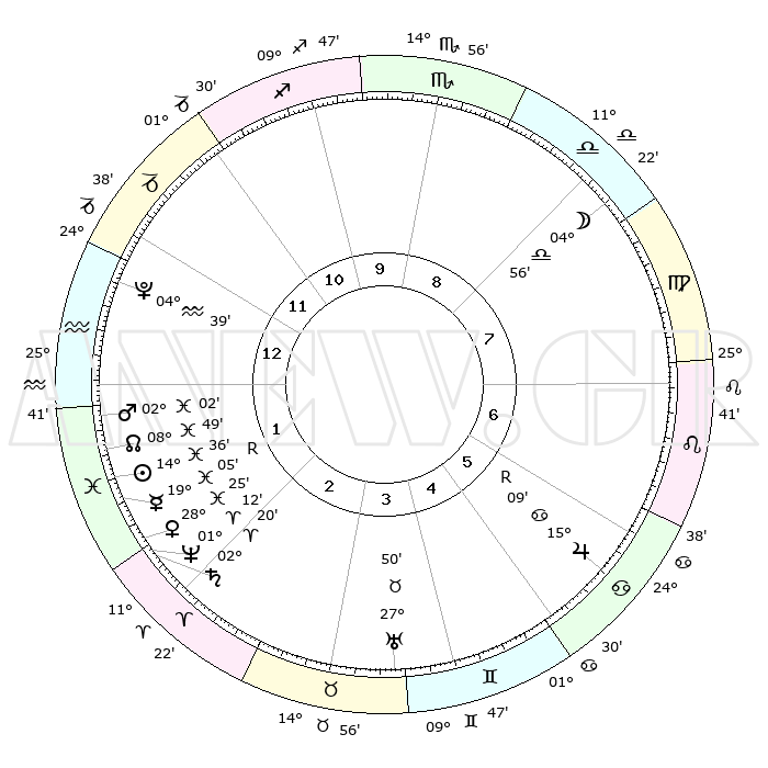 | | ΘΕΣΕΙΣ ΠΛΑΝΗΤΩΝ ΑΣΤΡΟΛΟΓΙΚΟΥ ΧΑΡΤΗ ΤΗΣ ΣΤΙΓΜΗΣ ΑΥΤΗΣ | | | | Πλανήτης | Ζώδιο | Μοίρες | Δεκαήμ. | Σε οίκο | Απόκλιση | | Ακμές των οίκων | | Ηλιος | Ιχθείς | 14°29' | Δεύτερο | 2 | 06 S 07 | | 1ος | 05°24' | Αιγόκερως | | Σελήνη | Ζυγός | 03°24' | Πρώτο | 9 | 03 S 21 | | 2ος | 13°56' | Υδροχόος | | Ερμής | Ιχθείς | 19°12'R | Δεύτερο | 2 | 00 S 53 | | 3ος | 24°12' | Ιχθείς | | Αφροδίτη | Ιχθείς | 28°16' | Τρίτο | 3 | 01 S 52 | | 4ος | 27°14' | Κριός | | Αρης | Ιχθείς | 01°57' | Πρώτο | 2 | 11 S 48 | | 5ος | 22°43' | Ταύρος | | Δίας | Καρκίνος | 15°09'R | Δεύτερο | 7 | 22 N 55 | | 6ος | 14°13' | Δίδυμοι | | Κρόνος | Κριός | 02°20' | Πρώτο | 3 | 01 S 02 | | 7ος | 05°24' | Καρκίνος | | Ουρανός | Ταύρος | 27°50' | Τρίτο | 5 | 19 N 30 | | 8ος | 13°56' | Λέων | | Ποσειδώνας | Κριός | 01°12' | Πρώτο | 3 | 00 S 43 | | 9ος | 24°12' | Παρθένος | | Πλούτωνας | Υδροχόος | 04°39' | Πρώτο | 1 | 22 S 51 | | 10ος | 27°13' | Ζυγός | | Β. Δεσμός | Ιχθείς | 08°50' | Πρώτο | 2 | 08 S 15 | | 11ος | 22°43' | Σκορπιός | | Ωροσκόπος | Αιγόκερως | 05°24' | Πρώτο | | | 12ος | 14°13' | Τοξότης | | Μεσουράνημα | Ζυγός | 27°13' | Τρίτο | | | |