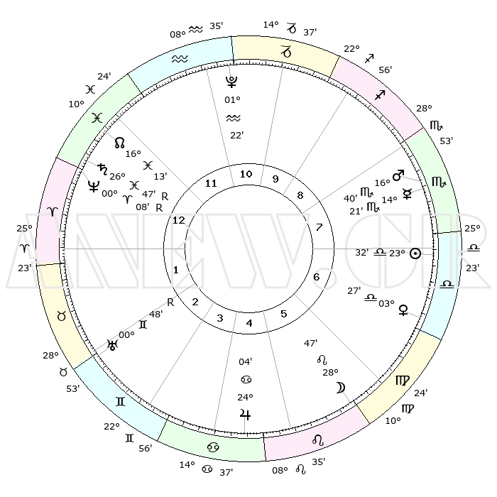 | ΘΕΣΕΙΣ ΠΛΑΝΗΤΩΝ ΑΣΤΡΟΛΟΓΙΚΟΥ ΧΑΡΤΗ ΤΗΣ ΣΤΙΓΜΗΣ ΑΥΤΗΣ | | Πλανήτης | Ζώδιο | Μοίρες | Δεκαήμ. | Σε οίκο | Απόκλιση | | Ακμές των οίκων | Ηλιος | Ζυγός | 22°26' | Τρίτο | 8 | 08 S 44 | | 1ος | 21°14' | Υδροχόος | Σελήνη | Λέων | 14°30' | Δεύτερο | 6 | 19 N 14 | | 2ος | 07°03' | Κριός | Ερμής | Σκορπιός | 12°50' | Δεύτερο | 9 | 17 S 23 | | 3ος | 11°31' | Ταύρος | Αφροδίτη | Ζυγός | 02°04' | Πρώτο | 7 | 00 N 34 | | 4ος | 06°52' | Δίδυμοι | Αρης | Σκορπιός | 15°53' | Δεύτερο | 9 | 16 S 49 | | 5ος | 28°39' | Δίδυμοι | Δίας | Καρκίνος | 23°58' | Τρίτο | 6 | 21 N 21 | | 6ος | 21°24' | Καρκίνος | Κρόνος | Ιχθείς | 26°51'R | Τρίτο | 1 | 03 S 33 | | 7ος | 21°14' | Λέων | Ουρανός | Δίδυμοι | 00°50'R | Πρώτο | 3 | 20 N 07 | | 8ος | 07°03' | Ζυγός | Ποσειδώνας | Κριός | 00°10'R | Πρώτο | 1 | 01 S 12 | | 9ος | 11°31' | Σκορπιός | Πλούτωνας | Υδροχόος | 01°22' | Πρώτο | 12 | 23 S 32 | | 10ος | 06°52' | Τοξότης | Β. Δεσμός | Ιχθείς | 16°16' | Δεύτερο | 1 | 05 S 25 | | 11ος | 28°39' | Τοξότης | Ωροσκόπος | Υδροχόος | 21°14' | Τρίτο | | | 12ος | 21°24' | Αιγόκερως | Μεσουράνημα | Τοξότης | 06°52' | Πρώτο | | | |