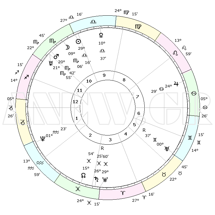 | ΘΕΣΕΙΣ ΠΛΑΝΗΤΩΝ ΑΣΤΡΟΛΟΓΙΚΟΥ ΧΑΡΤΗ ΤΗΣ ΣΤΙΓΜΗΣ ΑΥΤΗΣ | | Πλανήτης | Ζώδιο | Μοίρες | Δεκαήμ. | Σε οίκο | Απόκλιση | | Ακμές των οίκων | Ηλιος | Ζυγός | 28°54' | Τρίτο | 2 | 11 S 05 | | 1ος | 16°17' | Παρθένος | Σελήνη | Σκορπιός | 04°45' | Πρώτο | 2 | 16 S 39 | | 2ος | 11°45' | Ζυγός | Ερμής | Σκορπιός | 21°28' | Τρίτο | 3 | 20 S 27 | | 3ος | 11°34' | Σκορπιός | Αφροδίτη | Ζυγός | 10°10' | Δεύτερο | 1 | 02 S 37 | | 4ος | 14°31' | Τοξότης | Αρης | Σκορπιός | 20°26' | Τρίτο | 3 | 18 S 08 | | 5ος | 17°49' | Αιγόκερως | Δίας | Καρκίνος | 24°28' | Τρίτο | 11 | 21 N 17 | | 6ος | 18°48' | Υδροχόος | Κρόνος | Ιχθείς | 26°27'R | Τρίτο | 7 | 03 S 42 | | 7ος | 16°17' | Ιχθείς | Ουρανός | Δίδυμοι | 00°38'R | Πρώτο | 9 | 20 N 04 | | 8ος | 11°45' | Κριός | Ποσειδώνας | Κριός | 00°00'R | Πρώτο | 7 | 01 S 15 | | 9ος | 11°34' | Ταύρος | Πλούτωνας | Υδροχόος | 01°23' | Πρώτο | 5 | 23 S 32 | | 10ος | 14°31' | Δίδυμοι | Β. Δεσμός | Ιχθείς | 15°56' | Δεύτερο | 6 | 05 S 33 | | 11ος | 17°49' | Καρκίνος | Ωροσκόπος | Παρθένος | 16°17' | Δεύτερο | | | 12ος | 18°48' | Λέων | Μεσουράνημα | Δίδυμοι | 14°31' | Δεύτερο | | | |