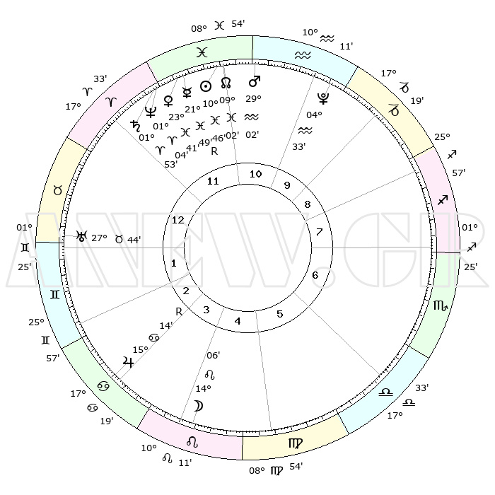 | | ΘΕΣΕΙΣ ΠΛΑΝΗΤΩΝ ΑΣΤΡΟΛΟΓΙΚΟΥ ΧΑΡΤΗ ΤΗΣ ΣΤΙΓΜΗΣ ΑΥΤΗΣ | | | | Πλανήτης | Ζώδιο | Μοίρες | Δεκαήμ. | Σε οίκο | Απόκλιση | | Ακμές των οίκων | | Ηλιος | Ιχθείς | 10°43' | Δεύτερο | 11 | 07 S 33 | | 1ος | 04°38' | Ταύρος | | Σελήνη | Λέων | 13°19' | Δεύτερο | 4 | 19 N 01 | | 2ος | 05°35' | Δίδυμοι | | Ερμής | Ιχθείς | 21°50'R | Τρίτο | 12 | 00 S 10 | | 3ος | 28°41' | Δίδυμοι | | Αφροδίτη | Ιχθείς | 23°36' | Τρίτο | 12 | 03 S 47 | | 4ος | 20°25' | Καρκίνος | | Αρης | Υδροχόος | 28°60' | Τρίτο | 11 | 12 S 51 | | 5ος | 15°18' | Λέων | | Δίας | Καρκίνος | 15°15'R | Δεύτερο | 3 | 22 N 54 | | 6ος | 18°56' | Παρθένος | | Κρόνος | Κριός | 01°53' | Πρώτο | 12 | 01 S 13 | | 7ος | 04°38' | Σκορπιός | | Ουρανός | Ταύρος | 27°44' | Τρίτο | 1 | 19 N 29 | | 8ος | 05°35' | Τοξότης | | Ποσειδώνας | Κριός | 01°04' | Πρώτο | 12 | 00 S 47 | | 9ος | 28°41' | Τοξότης | | Πλούτωνας | Υδροχόος | 04°33' | Πρώτο | 10 | 22 S 52 | | 10ος | 20°25' | Αιγόκερως | | Β. Δεσμός | Ιχθείς | 09°02' | Πρώτο | 11 | 08 S 11 | | 11ος | 15°18' | Υδροχόος | | Ωροσκόπος | Ταύρος | 04°38' | Πρώτο | | | 12ος | 18°56' | Ιχθείς | | Μεσουράνημα | Αιγόκερως | 20°25' | Τρίτο | | | |