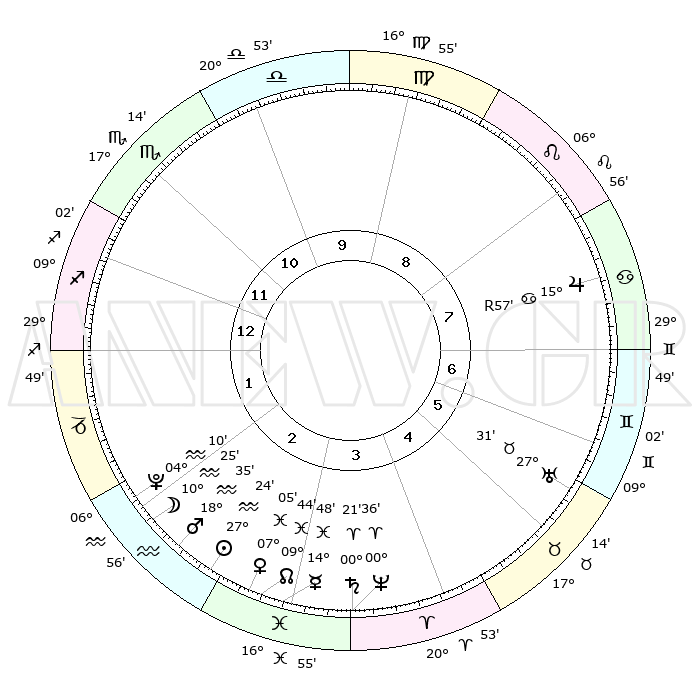| | ΘΕΣΕΙΣ ΠΛΑΝΗΤΩΝ ΑΣΤΡΟΛΟΓΙΚΟΥ ΧΑΡΤΗ ΤΗΣ ΣΤΙΓΜΗΣ ΑΥΤΗΣ | | | | Πλανήτης | Ζώδιο | Μοίρες | Δεκαήμ. | Σε οίκο | Απόκλιση | | Ακμές των οίκων | | Ηλιος | Υδροχόος | 27°21' | Τρίτο | 3 | 12 S 23 | | 1ος | 12°46' | Τοξότης | | Σελήνη | Υδροχόος | 09°43' | Πρώτο | 2 | 20 S 18 | | 2ος | 16°00' | Αιγόκερως | | Ερμής | Ιχθείς | 14°44' | Δεύτερο | 3 | 05 S 45 | | 3ος | 23°51' | Υδροχόος | | Αφροδίτη | Ιχθείς | 07°01' | Πρώτο | 3 | 10 S 18 | | 4ος | 29°43' | Ιχθείς | | Αρης | Υδροχόος | 18°32' | Δεύτερο | 2 | 16 S 18 | | 5ος | 28°53' | Κριός | | Δίας | Καρκίνος | 15°57'R | Δεύτερο | 7 | 22 N 48 | | 6ος | 22°18' | Ταύρος | | Κρόνος | Κριός | 00°20' | Πρώτο | 4 | 01 S 50 | | 7ος | 12°46' | Δίδυμοι | | Ουρανός | Ταύρος | 27°31' | Τρίτο | 6 | 19 N 25 | | 8ος | 16°00' | Καρκίνος | | Ποσειδώνας | Κριός | 00°36' | Πρώτο | 4 | 00 S 58 | | 9ος | 23°51' | Λέων | | Πλούτωνας | Υδροχόος | 04°10' | Πρώτο | 2 | 22 S 56 | | 10ος | 29°43' | Παρθένος | | Β. Δεσμός | Ιχθείς | 09°44' | Πρώτο | 3 | 07 S 55 | | 11ος | 28°53' | Ζυγός | | Ωροσκόπος | Τοξότης | 12°46' | Δεύτερο | | | 12ος | 22°18' | Σκορπιός | | Μεσουράνημα | Παρθένος | 29°43' | Τρίτο | | | |