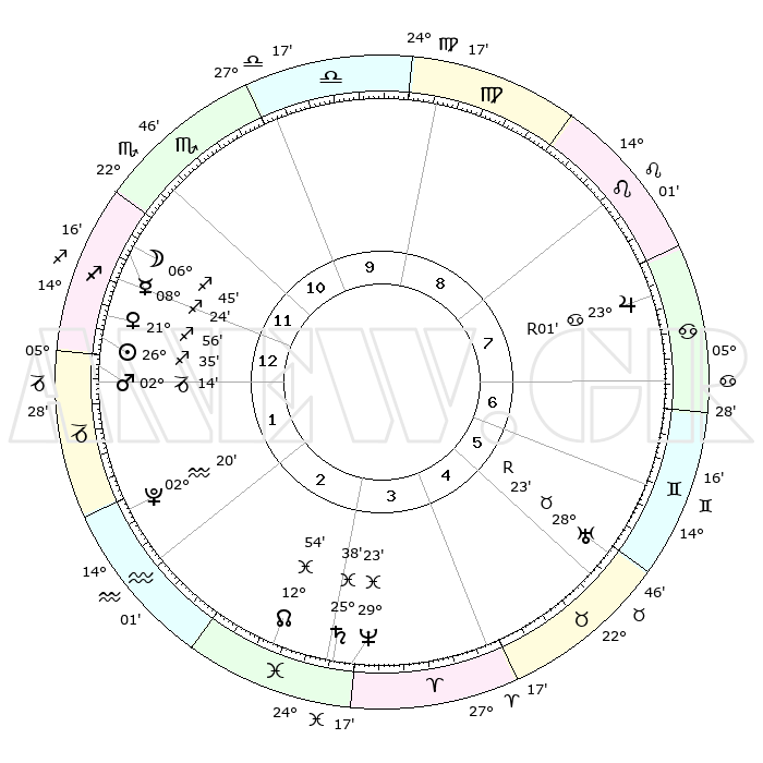 | | ΘΕΣΕΙΣ ΠΛΑΝΗΤΩΝ ΑΣΤΡΟΛΟΓΙΚΟΥ ΧΑΡΤΗ ΤΗΣ ΣΤΙΓΜΗΣ ΑΥΤΗΣ | | | | Πλανήτης | Ζώδιο | Μοίρες | Δεκαήμ. | Σε οίκο | Απόκλιση | | Ακμές των οίκων | | Ηλιος | Τοξότης | 26°14' | Τρίτο | 4 | 23 S 23 | | 1ος | 26°07' | Παρθένος | | Σελήνη | Τοξότης | 02°48' | Πρώτο | 3 | 25 S 33 | | 2ος | 22°25' | Ζυγός | | Ερμής | Τοξότης | 07°56' | Πρώτο | 3 | 20 S 29 | | 3ος | 22°42' | Σκορπιός | | Αφροδίτη | Τοξότης | 21°31' | Τρίτο | 3 | 23 S 07 | | 4ος | 25°39' | Τοξότης | | Αρης | Αιγόκερως | 01°59' | Πρώτο | 4 | 24 S 13 | | 5ος | 28°41' | Αιγόκερως | | Δίας | Καρκίνος | 23°03'R | Τρίτο | 10 | 21 N 40 | | 6ος | 29°16' | Υδροχόος | | Κρόνος | Ιχθείς | 25°38' | Τρίτο | 6 | 03 S 51 | | 7ος | 26°07' | Ιχθείς | | Ουρανός | Ταύρος | 28°23'R | Τρίτο | 9 | 19 N 36 | | 8ος | 22°25' | Κριός | | Ποσειδώνας | Ιχθείς | 29°23' | Τρίτο | 7 | 01 S 28 | | 9ος | 22°42' | Ταύρος | | Πλούτωνας | Υδροχόος | 02°19' | Πρώτο | 5 | 23 S 18 | | 10ος | 25°39' | Δίδυμοι | | Β. Δεσμός | Ιχθείς | 12°55' | Δεύτερο | 6 | 06 S 43 | | 11ος | 28°41' | Καρκίνος | | Ωροσκόπος | Παρθένος | 26°07' | Τρίτο | | | 12ος | 29°16' | Λέων | | Μεσουράνημα | Δίδυμοι | 25°39' | Τρίτο | | | |