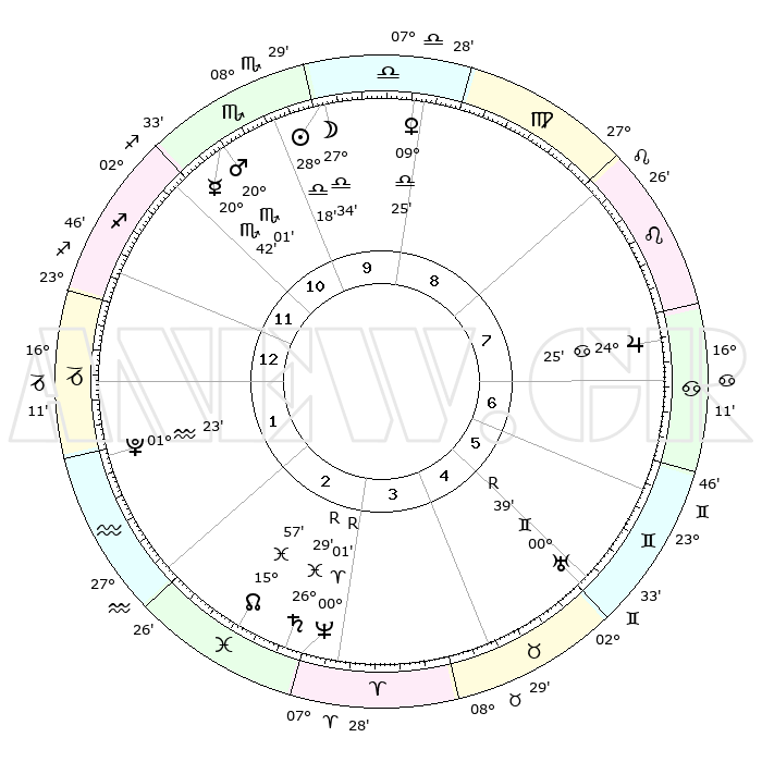 | ΘΕΣΕΙΣ ΠΛΑΝΗΤΩΝ ΑΣΤΡΟΛΟΓΙΚΟΥ ΧΑΡΤΗ ΤΗΣ ΣΤΙΓΜΗΣ ΑΥΤΗΣ | | Πλανήτης | Ζώδιο | Μοίρες | Δεκαήμ. | Σε οίκο | Απόκλιση | | Ακμές των οίκων | Ηλιος | Ζυγός | 27°56' | Τρίτο | 2 | 10 S 44 | | 1ος | 27°20' | Παρθένος | Σελήνη | Ζυγός | 23°17' | Τρίτο | 1 | 11 S 49 | | 2ος | 23°44' | Ζυγός | Ερμής | Σκορπιός | 20°14' | Τρίτο | 2 | 20 S 02 | | 3ος | 24°04' | Σκορπιός | Αφροδίτη | Ζυγός | 08°58' | Πρώτο | 1 | 02 S 08 | | 4ος | 27°01' | Τοξότης | Αρης | Σκορπιός | 19°46' | Δεύτερο | 2 | 17 S 57 | | 5ος | 00°02' | Υδροχόος | Δίας | Καρκίνος | 24°24' | Τρίτο | 10 | 21 N 18 | | 6ος | 00°34' | Ιχθείς | Κρόνος | Ιχθείς | 26°30'R | Τρίτο | 6 | 03 S 41 | | 7ος | 27°20' | Ιχθείς | Ουρανός | Δίδυμοι | 00°40'R | Πρώτο | 9 | 20 N 05 | | 8ος | 23°44' | Κριός | Ποσειδώνας | Κριός | 00°02'R | Πρώτο | 7 | 01 S 15 | | 9ος | 24°04' | Ταύρος | Πλούτωνας | Υδροχόος | 01°23' | Πρώτο | 5 | 23 S 32 | | 10ος | 27°01' | Δίδυμοι | Β. Δεσμός | Ιχθείς | 15°59' | Δεύτερο | 6 | 05 S 32 | | 11ος | 00°02' | Λέων | Ωροσκόπος | Παρθένος | 27°20' | Τρίτο | | | 12ος | 00°34' | Παρθένος | Μεσουράνημα | Δίδυμοι | 27°01' | Τρίτο | | | |