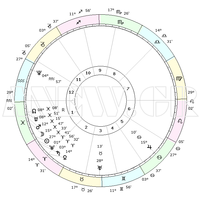 | | ΘΕΣΕΙΣ ΠΛΑΝΗΤΩΝ ΑΣΤΡΟΛΟΓΙΚΟΥ ΧΑΡΤΗ ΤΗΣ ΣΤΙΓΜΗΣ ΑΥΤΗΣ | | | | Πλανήτης | Ζώδιο | Μοίρες | Δεκαήμ. | Σε οίκο | Απόκλιση | | Ακμές των οίκων | | Ηλιος | Ιχθείς | 27°28' | Τρίτο | 2 | 01 S 00 | | 1ος | 24°33' | Αιγόκερως | | Σελήνη | Ιχθείς | 14°47' | Δεύτερο | 2 | 05 S 30 | | 2ος | 07°40' | Ιχθείς | | Ερμής | Ιχθείς | 08°52'R | Πρώτο | 2 | 06 S 42 | | 3ος | 16°53' | Κριός | | Αφροδίτη | Κριός | 14°26' | Δεύτερο | 2 | 04 N 49 | | 4ος | 16°19' | Ταύρος | | Αρης | Ιχθείς | 12°12' | Δεύτερο | 2 | 07 S 59 | | 5ος | 09°31' | Δίδυμοι | | Δίας | Καρκίνος | 15°10' | Δεύτερο | 6 | 22 N 56 | | 6ος | 00°47' | Καρκίνος | | Κρόνος | Κριός | 03°55' | Πρώτο | 2 | 00 S 23 | | 7ος | 24°33' | Καρκίνος | | Ουρανός | Ταύρος | 28°13' | Τρίτο | 4 | 19 N 35 | | 8ος | 07°40' | Παρθένος | | Ποσειδώνας | Κριός | 01°41' | Πρώτο | 2 | 00 S 32 | | 9ος | 16°53' | Ζυγός | | Πλούτωνας | Υδροχόος | 04°57' | Πρώτο | 1 | 22 S 49 | | 10ος | 16°19' | Σκορπιός | | Β. Δεσμός | Ιχθείς | 08°08' | Πρώτο | 2 | 08 S 31 | | 11ος | 09°31' | Τοξότης | | Ωροσκόπος | Αιγόκερως | 24°33' | Τρίτο | | | 12ος | 00°47' | Αιγόκερως | | Μεσουράνημα | Σκορπιός | 16°19' | Δεύτερο | | | |