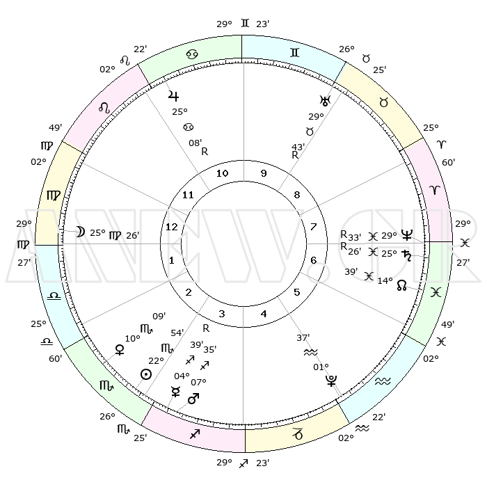 | | ΘΕΣΕΙΣ ΠΛΑΝΗΤΩΝ ΑΣΤΡΟΛΟΓΙΚΟΥ ΧΑΡΤΗ ΤΗΣ ΣΤΙΓΜΗΣ ΑΥΤΗΣ | | | | Πλανήτης | Ζώδιο | Μοίρες | Δεκαήμ. | Σε οίκο | Απόκλιση | | Ακμές των οίκων | | Ηλιος | Σκορπιός | 22°53' | Τρίτο | 3 | 18 S 29 | | 1ος | 21°40' | Παρθένος | | Σελήνη | Παρθένος | 25°07' | Τρίτο | 1 | 01 N 13 | | 2ος | 17°36' | Ζυγός | | Ερμής | Τοξότης | 04°41'R | Πρώτο | 3 | 22 S 16 | | 3ος | 17°42' | Σκορπιός | | Αφροδίτη | Σκορπιός | 10°07' | Δεύτερο | 2 | 13 S 42 | | 4ος | 20°38' | Τοξότης | | Αρης | Τοξότης | 07°33' | Πρώτο | 3 | 22 S 05 | | 5ος | 23°46' | Αιγόκερως | | Δίας | Καρκίνος | 25°08'R | Τρίτο | 11 | 21 N 13 | | 6ος | 24°31' | Υδροχόος | | Κρόνος | Ιχθείς | 25°26'R | Τρίτο | 7 | 04 S 02 | | 7ος | 21°40' | Ιχθείς | | Ουρανός | Ταύρος | 29°43'R | Τρίτο | 9 | 19 N 53 | | 8ος | 17°36' | Κριός | | Ποσειδώνας | Ιχθείς | 29°33'R | Τρίτο | 7 | 01 S 26 | | 9ος | 17°42' | Ταύρος | | Πλούτωνας | Υδροχόος | 01°37' | Πρώτο | 5 | 23 S 28 | | 10ος | 20°38' | Δίδυμοι | | Β. Δεσμός | Ιχθείς | 14°39' | Δεύτερο | 6 | 06 S 02 | | 11ος | 23°46' | Καρκίνος | | Ωροσκόπος | Παρθένος | 21°40' | Τρίτο | | | 12ος | 24°31' | Λέων | | Μεσουράνημα | Δίδυμοι | 20°38' | Τρίτο | | | |