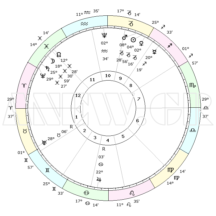 | | ΘΕΣΕΙΣ ΠΛΑΝΗΤΩΝ ΑΣΤΡΟΛΟΓΙΚΟΥ ΧΑΡΤΗ ΤΗΣ ΣΤΙΓΜΗΣ ΑΥΤΗΣ | | | | Πλανήτης | Ζώδιο | Μοίρες | Δεκαήμ. | Σε οίκο | Απόκλιση | | Ακμές των οίκων | | Ηλιος | Αιγόκερως | 04°51' | Πρώτο | 10 | 23 S 21 | | 1ος | 10°23' | Ιχθείς | | Σελήνη | Ιχθείς | 17°22' | Δεύτερο | 1 | 04 S 30 | | 2ος | 24°36' | Κριός | | Ερμής | Τοξότης | 20°12' | Τρίτο | 10 | 22 S 59 | | 3ος | 25°20' | Ταύρος | | Αφροδίτη | Αιγόκερως | 02°09' | Πρώτο | 10 | 23 S 42 | | 4ος | 18°49' | Δίδυμοι | | Αρης | Αιγόκερως | 08°24' | Πρώτο | 10 | 24 S 01 | | 5ος | 10°33' | Καρκίνος | | Δίας | Καρκίνος | 22°04'R | Τρίτο | 5 | 21 N 51 | | 6ος | 05°16' | Λέων | | Κρόνος | Ιχθείς | 25°59' | Τρίτο | 1 | 03 S 41 | | 7ος | 10°23' | Παρθένος | | Ουρανός | Ταύρος | 28°06'R | Τρίτο | 3 | 19 N 32 | | 8ος | 24°36' | Ζυγός | | Ποσειδώνας | Ιχθείς | 29°27' | Τρίτο | 1 | 01 S 27 | | 9ος | 25°20' | Σκορπιός | | Πλούτωνας | Υδροχόος | 02°33' | Πρώτο | 11 | 23 S 15 | | 10ος | 18°49' | Τοξότης | | Β. Δεσμός | Ιχθείς | 12°28' | Δεύτερο | 1 | 06 S 53 | | 11ος | 10°33' | Αιγόκερως | | Ωροσκόπος | Ιχθείς | 10°23' | Δεύτερο | | | 12ος | 05°16' | Υδροχόος | | Μεσουράνημα | Τοξότης | 18°49' | Δεύτερο | | | |