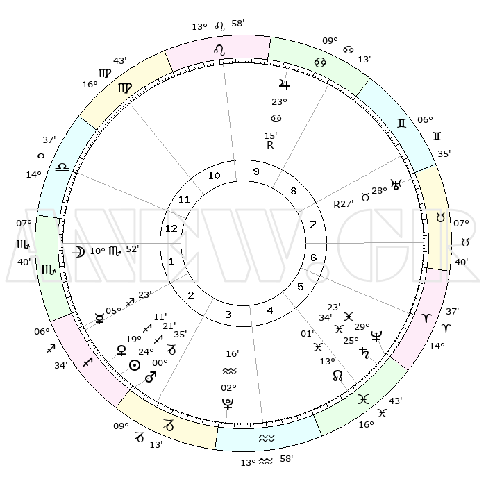 | | ΘΕΣΕΙΣ ΠΛΑΝΗΤΩΝ ΑΣΤΡΟΛΟΓΙΚΟΥ ΧΑΡΤΗ ΤΗΣ ΣΤΙΓΜΗΣ ΑΥΤΗΣ | | | | Πλανήτης | Ζώδιο | Μοίρες | Δεκαήμ. | Σε οίκο | Απόκλιση | | Ακμές των οίκων | | Ηλιος | Τοξότης | 24°03' | Τρίτο | 5 | 23 S 18 | | 1ος | 10°45' | Λέων | | Σελήνη | Σκορπιός | 07°20' | Πρώτο | 4 | 17 S 49 | | 2ος | 02°39' | Παρθένος | | Ερμής | Τοξότης | 04°59' | Πρώτο | 4 | 19 S 42 | | 3ος | 29°09' | Παρθένος | | Αφροδίτη | Τοξότης | 18°48' | Δεύτερο | 5 | 22 S 50 | | 4ος | 01°17' | Σκορπιός | | Αρης | Αιγόκερως | 00°22' | Πρώτο | 5 | 24 S 13 | | 5ος | 06°50' | Τοξότης | | Δίας | Καρκίνος | 23°17'R | Τρίτο | 12 | 21 N 37 | | 6ος | 10°53' | Αιγόκερως | | Κρόνος | Ιχθείς | 25°33' | Τρίτο | 8 | 03 S 53 | | 7ος | 10°45' | Υδροχόος | | Ουρανός | Ταύρος | 28°28'R | Τρίτο | 10 | 19 N 37 | | 8ος | 02°39' | Ιχθείς | | Ποσειδώνας | Ιχθείς | 29°23' | Τρίτο | 9 | 01 S 29 | | 9ος | 29°09' | Ιχθείς | | Πλούτωνας | Υδροχόος | 02°16' | Πρώτο | 6 | 23 S 19 | | 10ος | 01°17' | Ταύρος | | Β. Δεσμός | Ιχθείς | 13°02' | Δεύτερο | 8 | 06 S 40 | | 11ος | 06°50' | Δίδυμοι | | Ωροσκόπος | Λέων | 10°45' | Δεύτερο | | | 12ος | 10°53' | Καρκίνος | | Μεσουράνημα | Ταύρος | 01°17' | Πρώτο | | | |