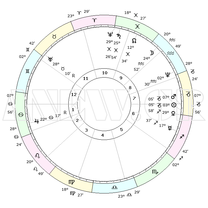 | | ΘΕΣΕΙΣ ΠΛΑΝΗΤΩΝ ΑΣΤΡΟΛΟΓΙΚΟΥ ΧΑΡΤΗ ΤΗΣ ΣΤΙΓΜΗΣ ΑΥΤΗΣ | | | | Πλανήτης | Ζώδιο | Μοίρες | Δεκαήμ. | Σε οίκο | Απόκλιση | | Ακμές των οίκων | | Ηλιος | Αιγόκερως | 02°60' | Πρώτο | 7 | 23 S 24 | | 1ος | 11°52' | Δίδυμοι | | Σελήνη | Υδροχόος | 23°54' | Τρίτο | 10 | 14 S 59 | | 2ος | 04°35' | Καρκίνος | | Ερμής | Τοξότης | 17°30' | Δεύτερο | 7 | 22 S 32 | | 3ος | 25°47' | Καρκίνος | | Αφροδίτη | Τοξότης | 29°52' | Τρίτο | 7 | 23 S 39 | | 4ος | 19°38' | Λέων | | Αρης | Αιγόκερως | 07°01' | Πρώτο | 8 | 24 S 05 | | 5ος | 20°16' | Παρθένος | | Δίας | Καρκίνος | 22°17'R | Τρίτο | 2 | 21 N 48 | | 6ος | 00°10' | Σκορπιός | | Κρόνος | Ιχθείς | 25°54' | Τρίτο | 11 | 03 S 44 | | 7ος | 11°52' | Τοξότης | | Ουρανός | Ταύρος | 28°10'R | Τρίτο | 12 | 19 N 33 | | 8ος | 04°35' | Αιγόκερως | | Ποσειδώνας | Ιχθείς | 29°26' | Τρίτο | 11 | 01 S 27 | | 9ος | 25°47' | Αιγόκερως | | Πλούτωνας | Υδροχόος | 02°30' | Πρώτο | 9 | 23 S 16 | | 10ος | 19°38' | Υδροχόος | | Β. Δεσμός | Ιχθείς | 12°34' | Δεύτερο | 10 | 06 S 51 | | 11ος | 20°16' | Ιχθείς | | Ωροσκόπος | Δίδυμοι | 11°52' | Δεύτερο | | | 12ος | 00°10' | Ταύρος | | Μεσουράνημα | Υδροχόος | 19°38' | Δεύτερο | | | |