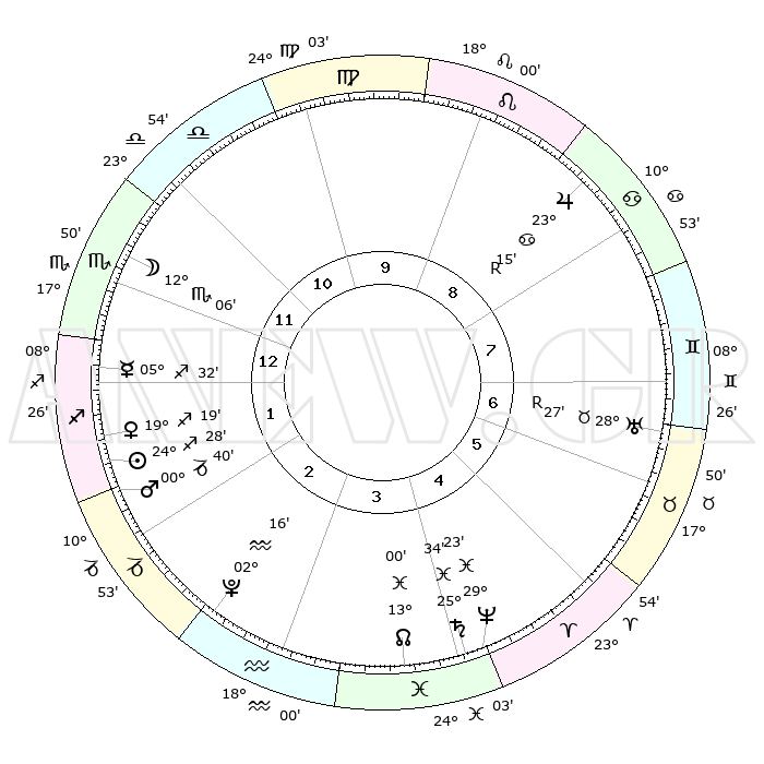 | | ΘΕΣΕΙΣ ΠΛΑΝΗΤΩΝ ΑΣΤΡΟΛΟΓΙΚΟΥ ΧΑΡΤΗ ΤΗΣ ΣΤΙΓΜΗΣ ΑΥΤΗΣ | | | | Πλανήτης | Ζώδιο | Μοίρες | Δεκαήμ. | Σε οίκο | Απόκλιση | | Ακμές των οίκων | | Ηλιος | Τοξότης | 24°05' | Τρίτο | 5 | 23 S 18 | | 1ος | 20°48' | Λέων | | Σελήνη | Σκορπιός | 07°45' | Πρώτο | 3 | 17 S 58 | | 2ος | 13°42' | Παρθένος | | Ερμής | Τοξότης | 05°02' | Πρώτο | 4 | 19 S 43 | | 3ος | 11°26' | Ζυγός | | Αφροδίτη | Τοξότης | 18°51' | Δεύτερο | 4 | 22 S 50 | | 4ος | 14°08' | Σκορπιός | | Αρης | Αιγόκερως | 00°23' | Πρώτο | 5 | 24 S 13 | | 5ος | 18°59' | Τοξότης | | Δίας | Καρκίνος | 23°17'R | Τρίτο | 12 | 21 N 37 | | 6ος | 21°47' | Αιγόκερως | | Κρόνος | Ιχθείς | 25°33' | Τρίτο | 8 | 03 S 53 | | 7ος | 20°48' | Υδροχόος | | Ουρανός | Ταύρος | 28°28'R | Τρίτο | 10 | 19 N 37 | | 8ος | 13°42' | Ιχθείς | | Ποσειδώνας | Ιχθείς | 29°23' | Τρίτο | 8 | 01 S 29 | | 9ος | 11°26' | Κριός | | Πλούτωνας | Υδροχόος | 02°16' | Πρώτο | 6 | 23 S 19 | | 10ος | 14°08' | Ταύρος | | Β. Δεσμός | Ιχθείς | 13°02' | Δεύτερο | 7 | 06 S 40 | | 11ος | 18°59' | Δίδυμοι | | Ωροσκόπος | Λέων | 20°48' | Τρίτο | | | 12ος | 21°47' | Καρκίνος | | Μεσουράνημα | Ταύρος | 14°08' | Δεύτερο | | | |