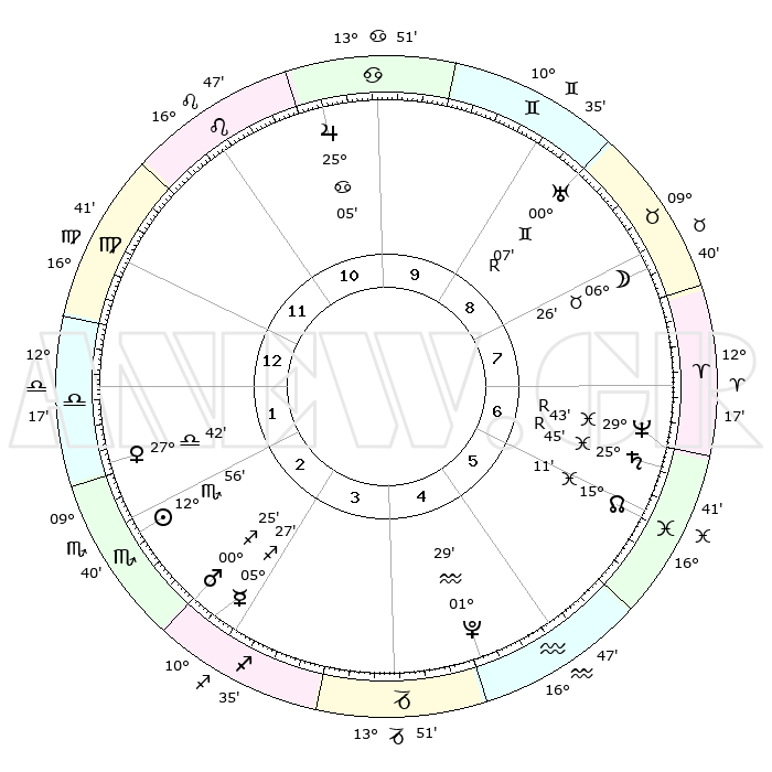 | | ΘΕΣΕΙΣ ΠΛΑΝΗΤΩΝ ΑΣΤΡΟΛΟΓΙΚΟΥ ΧΑΡΤΗ ΤΗΣ ΣΤΙΓΜΗΣ ΑΥΤΗΣ | | | | Πλανήτης | Ζώδιο | Μοίρες | Δεκαήμ. | Σε οίκο | Απόκλιση | | Ακμές των οίκων | | Ηλιος | Σκορπιός | 12°49' | Δεύτερο | 3 | 15 S 41 | | 1ος | 10°10' | Παρθένος | | Σελήνη | Ταύρος | 04°46' | Πρώτο | 9 | 16 N 40 | | 2ος | 05°04' | Ζυγός | | Ερμής | Τοξότης | 05°23' | Πρώτο | 3 | 23 S 58 | | 3ος | 04°32' | Σκορπιός | | Αφροδίτη | Ζυγός | 27°34' | Τρίτο | 2 | 09 S 17 | | 4ος | 07°29' | Τοξότης | | Αρης | Τοξότης | 00°20' | Πρώτο | 3 | 20 S 38 | | 5ος | 11°04' | Αιγόκερως | | Δίας | Καρκίνος | 25°05' | Τρίτο | 11 | 21 N 12 | | 6ος | 12°21' | Υδροχόος | | Κρόνος | Ιχθείς | 25°45'R | Τρίτο | 7 | 03 S 56 | | 7ος | 10°10' | Ιχθείς | | Ουρανός | Δίδυμοι | 00°07'R | Πρώτο | 9 | 19 N 58 | | 8ος | 05°04' | Κριός | | Ποσειδώνας | Ιχθείς | 29°43'R | Τρίτο | 7 | 01 S 22 | | 9ος | 04°32' | Ταύρος | | Πλούτωνας | Υδροχόος | 01°29' | Πρώτο | 5 | 23 S 30 | | 10ος | 07°29' | Δίδυμοι | | Β. Δεσμός | Ιχθείς | 15°11' | Δεύτερο | 7 | 05 S 50 | | 11ος | 11°04' | Καρκίνος | | Ωροσκόπος | Παρθένος | 10°10' | Δεύτερο | | | 12ος | 12°21' | Λέων | | Μεσουράνημα | Δίδυμοι | 07°29' | Πρώτο | | | |