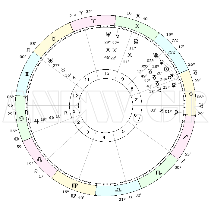 | | ΘΕΣΕΙΣ ΠΛΑΝΗΤΩΝ ΑΣΤΡΟΛΟΓΙΚΟΥ ΧΑΡΤΗ ΤΗΣ ΣΤΙΓΜΗΣ ΑΥΤΗΣ | | | | Πλανήτης | Ζώδιο | Μοίρες | Δεκαήμ. | Σε οίκο | Απόκλιση | | Ακμές των οίκων | | Ηλιος | Αιγόκερως | 26°21' | Τρίτο | 9 | 20 S 53 | | 1ος | 03°44' | Δίδυμοι | | Σελήνη | Τοξότης | 29°56' | Τρίτο | 8 | 28 S 15 | | 2ος | 27°49' | Δίδυμοι | | Ερμής | Αιγόκερως | 23°04' | Τρίτο | 9 | 23 S 18 | | 3ος | 19°07' | Καρκίνος | | Αφροδίτη | Αιγόκερως | 28°42' | Τρίτο | 9 | 21 S 25 | | 4ος | 12°10' | Λέων | | Αρης | Αιγόκερως | 24°39' | Τρίτο | 9 | 22 S 09 | | 5ος | 11°18' | Παρθένος | | Δίας | Καρκίνος | 19°17'R | Δεύτερο | 3 | 22 N 19 | | 6ος | 20°17' | Ζυγός | | Κρόνος | Ιχθείς | 27°22' | Τρίτο | 11 | 03 S 05 | | 7ος | 03°44' | Τοξότης | | Ουρανός | Ταύρος | 27°36'R | Τρίτο | 12 | 19 N 26 | | 8ος | 27°49' | Τοξότης | | Ποσειδώνας | Ιχθείς | 29°46' | Τρίτο | 11 | 01 S 18 | | 9ος | 19°07' | Αιγόκερως | | Πλούτωνας | Υδροχόος | 03°12' | Πρώτο | 9 | 23 S 07 | | 10ος | 12°10' | Υδροχόος | | Β. Δεσμός | Ιχθείς | 11°21' | Δεύτερο | 11 | 07 S 18 | | 11ος | 11°18' | Ιχθείς | | Ωροσκόπος | Δίδυμοι | 03°44' | Πρώτο | | | 12ος | 20°17' | Κριός | | Μεσουράνημα | Υδροχόος | 12°10' | Δεύτερο | | | |