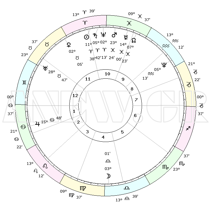 | | ΘΕΣΕΙΣ ΠΛΑΝΗΤΩΝ ΑΣΤΡΟΛΟΓΙΚΟΥ ΧΑΡΤΗ ΤΗΣ ΣΤΙΓΜΗΣ ΑΥΤΗΣ | | | | Πλανήτης | Ζώδιο | Μοίρες | Δεκαήμ. | Σε οίκο | Απόκλιση | | Ακμές των οίκων | | Ηλιος | Κριός | 11°31' | Δεύτερο | 12 | 04 N 33 | | 1ος | 16°05' | Ταύρος | | Σελήνη | Ζυγός | 01°34' | Πρώτο | 6 | 02 S 29 | | 2ος | 14°03' | Δίδυμοι | | Ερμής | Ιχθείς | 13°54' | Δεύτερο | 11 | 07 S 34 | | 3ος | 06°13' | Καρκίνος | | Αφροδίτη | Ταύρος | 01°57' | Πρώτο | 12 | 11 N 44 | | 4ος | 28°13' | Καρκίνος | | Αρης | Ιχθείς | 23°19' | Τρίτο | 11 | 03 S 37 | | 5ος | 24°31' | Λέων | | Δίας | Καρκίνος | 15°48' | Δεύτερο | 3 | 22 N 52 | | 6ος | 00°27' | Ζυγός | | Κρόνος | Κριός | 05°42' | Πρώτο | 12 | 00 N 18 | | 7ος | 16°05' | Σκορπιός | | Ουρανός | Ταύρος | 28°46' | Τρίτο | 1 | 19 N 43 | | 8ος | 14°03' | Τοξότης | | Ποσειδώνας | Κριός | 02°13' | Πρώτο | 12 | 00 S 19 | | 9ος | 06°13' | Αιγόκερως | | Πλούτωνας | Υδροχόος | 05°13' | Πρώτο | 10 | 22 S 47 | | 10ος | 28°13' | Αιγόκερως | | Β. Δεσμός | Ιχθείς | 07°23' | Πρώτο | 11 | 08 S 48 | | 11ος | 24°31' | Υδροχόος | | Ωροσκόπος | Ταύρος | 16°05' | Δεύτερο | | | 12ος | 00°27' | Κριός | | Μεσουράνημα | Αιγόκερως | 28°13' | Τρίτο | | | |