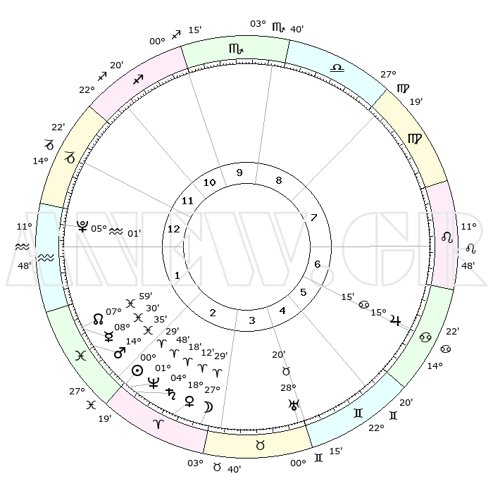 | | ΘΕΣΕΙΣ ΠΛΑΝΗΤΩΝ ΑΣΤΡΟΛΟΓΙΚΟΥ ΧΑΡΤΗ ΤΗΣ ΣΤΙΓΜΗΣ ΑΥΤΗΣ | | | | Πλανήτης | Ζώδιο | Μοίρες | Δεκαήμ. | Σε οίκο | Απόκλιση | | Ακμές των οίκων | | Ηλιος | Κριός | 00°25' | Πρώτο | 2 | 00 N 10 | | 1ος | 15°04' | Αιγόκερως | | Σελήνη | Κριός | 26°33' | Τρίτο | 3 | 13 N 51 | | 2ος | 26°03' | Υδροχόος | | Ερμής | Ιχθείς | 08°30' | Πρώτο | 2 | 07 S 31 | | 3ος | 06°09' | Κριός | | Αφροδίτη | Κριός | 18°07' | Δεύτερο | 3 | 06 N 19 | | 4ος | 07°22' | Ταύρος | | Αρης | Ιχθείς | 14°32' | Δεύτερο | 2 | 07 S 05 | | 5ος | 01°34' | Δίδυμοι | | Δίας | Καρκίνος | 15°15' | Δεύτερο | 7 | 22 N 55 | | 6ος | 22°48' | Δίδυμοι | | Κρόνος | Κριός | 04°18' | Πρώτο | 2 | 00 S 15 | | 7ος | 15°04' | Καρκίνος | | Ουρανός | Ταύρος | 28°19' | Τρίτο | 4 | 19 N 37 | | 8ος | 26°03' | Λέων | | Ποσειδώνας | Κριός | 01°48' | Πρώτο | 2 | 00 S 29 | | 9ος | 06°09' | Ζυγός | | Πλούτωνας | Υδροχόος | 05°01' | Πρώτο | 1 | 22 S 48 | | 10ος | 07°22' | Σκορπιός | | Β. Δεσμός | Ιχθείς | 07°59' | Πρώτο | 2 | 08 S 34 | | 11ος | 01°34' | Τοξότης | | Ωροσκόπος | Αιγόκερως | 15°04' | Δεύτερο | | | 12ος | 22°48' | Τοξότης | | Μεσουράνημα | Σκορπιός | 07°22' | Πρώτο | | | |