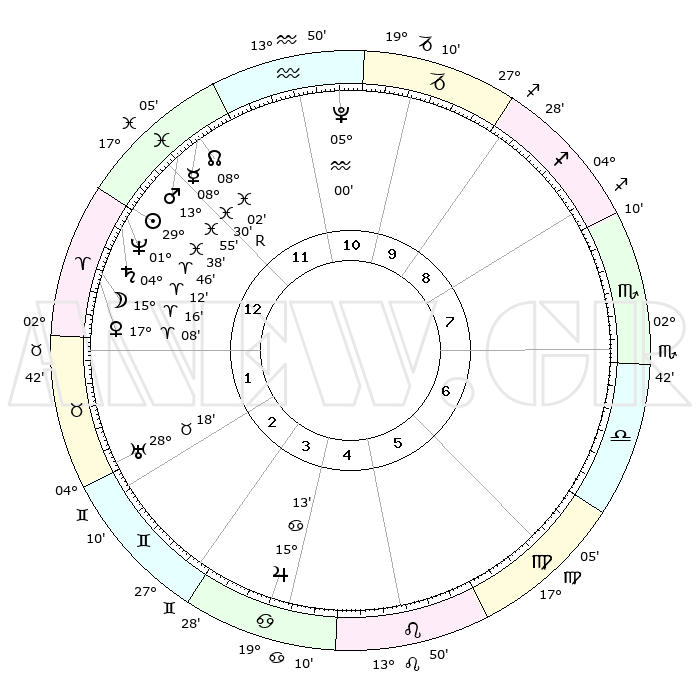 | | ΘΕΣΕΙΣ ΠΛΑΝΗΤΩΝ ΑΣΤΡΟΛΟΓΙΚΟΥ ΧΑΡΤΗ ΤΗΣ ΣΤΙΓΜΗΣ ΑΥΤΗΣ | | | | Πλανήτης | Ζώδιο | Μοίρες | Δεκαήμ. | Σε οίκο | Απόκλιση | | Ακμές των οίκων | | Ηλιος | Ιχθείς | 29°34' | Τρίτο | 1 | 00 S 10 | | 1ος | 19°41' | Ιχθείς | | Σελήνη | Κριός | 14°12' | Δεύτερο | 1 | 08 N 24 | | 2ος | 02°17' | Ταύρος | | Ερμής | Ιχθείς | 08°31'R | Πρώτο | 12 | 07 S 19 | | 3ος | 01°21' | Δίδυμοι | | Αφροδίτη | Κριός | 17°03' | Δεύτερο | 1 | 05 N 53 | | 4ος | 24°11' | Δίδυμοι | | Αρης | Ιχθείς | 13°51' | Δεύτερο | 12 | 07 S 21 | | 5ος | 16°07' | Καρκίνος | | Δίας | Καρκίνος | 15°13' | Δεύτερο | 4 | 22 N 55 | | 6ος | 12°02' | Λέων | | Κρόνος | Κριός | 04°11' | Πρώτο | 1 | 00 S 17 | | 7ος | 19°41' | Παρθένος | | Ουρανός | Ταύρος | 28°17' | Τρίτο | 2 | 19 N 36 | | 8ος | 02°17' | Σκορπιός | | Ποσειδώνας | Κριός | 01°46' | Πρώτο | 1 | 00 S 30 | | 9ος | 01°21' | Τοξότης | | Πλούτωνας | Υδροχόος | 04°60' | Πρώτο | 11 | 22 S 49 | | 10ος | 24°11' | Τοξότης | | Β. Δεσμός | Ιχθείς | 08°02' | Πρώτο | 12 | 08 S 33 | | 11ος | 16°07' | Αιγόκερως | | Ωροσκόπος | Ιχθείς | 19°41' | Δεύτερο | | | 12ος | 12°02' | Υδροχόος | | Μεσουράνημα | Τοξότης | 24°11' | Τρίτο | | | |