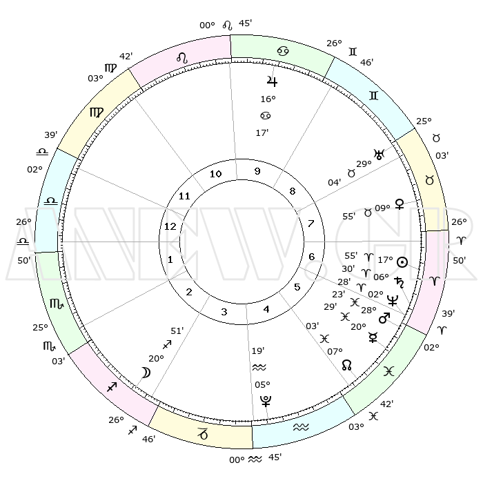 | | ΘΕΣΕΙΣ ΠΛΑΝΗΤΩΝ ΑΣΤΡΟΛΟΓΙΚΟΥ ΧΑΡΤΗ ΤΗΣ ΣΤΙΓΜΗΣ ΑΥΤΗΣ | | | | Πλανήτης | Ζώδιο | Μοίρες | Δεκαήμ. | Σε οίκο | Απόκλιση | | Ακμές των οίκων | | Ηλιος | Κριός | 17°51' | Δεύτερο | 7 | 07 N 00 | | 1ος | 08°42' | Ζυγός | | Σελήνη | Τοξότης | 20°07' | Τρίτο | 3 | 28 S 06 | | 2ος | 05°53' | Σκορπιός | | Ερμής | Ιχθείς | 20°25' | Τρίτο | 6 | 05 S 46 | | 3ος | 06°39' | Τοξότης | | Αφροδίτη | Ταύρος | 09°51' | Πρώτο | 8 | 14 N 37 | | 4ος | 09°48' | Αιγόκερως | | Αρης | Ιχθείς | 28°20' | Τρίτο | 6 | 01 S 36 | | 5ος | 12°43' | Υδροχόος | | Δίας | Καρκίνος | 16°17' | Δεύτερο | 10 | 22 N 49 | | 6ος | 12°48' | Ιχθείς | | Κρόνος | Κριός | 06°29' | Πρώτο | 6 | 00 N 37 | | 7ος | 08°42' | Κριός | | Ουρανός | Ταύρος | 29°04' | Τρίτο | 8 | 19 N 47 | | 8ος | 05°53' | Ταύρος | | Ποσειδώνας | Κριός | 02°27' | Πρώτο | 6 | 00 S 14 | | 9ος | 06°39' | Δίδυμοι | | Πλούτωνας | Υδροχόος | 05°19' | Πρώτο | 4 | 22 S 47 | | 10ος | 09°48' | Καρκίνος | | Β. Δεσμός | Ιχθείς | 07°03' | Πρώτο | 5 | 08 S 55 | | 11ος | 12°43' | Λέων | | Ωροσκόπος | Ζυγός | 08°42' | Πρώτο | | | 12ος | 12°48' | Παρθένος | | Μεσουράνημα | Καρκίνος | 09°48' | Πρώτο | | | |