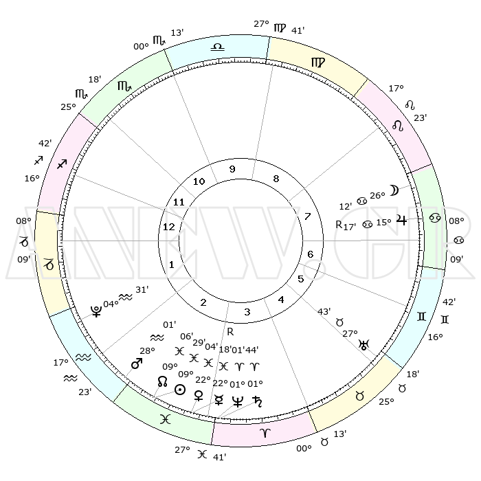 | | ΘΕΣΕΙΣ ΠΛΑΝΗΤΩΝ ΑΣΤΡΟΛΟΓΙΚΟΥ ΧΑΡΤΗ ΤΗΣ ΣΤΙΓΜΗΣ ΑΥΤΗΣ | | | | Πλανήτης | Ζώδιο | Μοίρες | Δεκαήμ. | Σε οίκο | Απόκλιση | | Ακμές των οίκων | | Ηλιος | Ιχθείς | 09°24' | Πρώτο | 3 | 08 S 02 | | 1ος | 14°29' | Τοξότης | | Σελήνη | Καρκίνος | 25°11' | Τρίτο | 8 | 24 N 42 | | 2ος | 18°04' | Αιγόκερως | | Ερμής | Ιχθείς | 22°20'R | Τρίτο | 3 | 00 S 10 | | 3ος | 26°12' | Υδροχόος | | Αφροδίτη | Ιχθείς | 21°59' | Τρίτο | 3 | 04 S 27 | | 4ος | 01°57' | Κριός | | Αρης | Υδροχόος | 27°58' | Τρίτο | 3 | 13 S 12 | | 5ος | 00°50' | Ταύρος | | Δίας | Καρκίνος | 15°17'R | Δεύτερο | 7 | 22 N 54 | | 6ος | 24°03' | Ταύρος | | Κρόνος | Κριός | 01°43' | Πρώτο | 3 | 01 S 16 | | 7ος | 14°29' | Δίδυμοι | | Ουρανός | Ταύρος | 27°43' | Τρίτο | 6 | 19 N 28 | | 8ος | 18°04' | Καρκίνος | | Ποσειδώνας | Κριός | 01°01' | Πρώτο | 3 | 00 S 48 | | 9ος | 26°12' | Λέων | | Πλούτωνας | Υδροχόος | 04°31' | Πρώτο | 2 | 22 S 53 | | 10ος | 01°57' | Ζυγός | | Β. Δεσμός | Ιχθείς | 09°06' | Πρώτο | 3 | 08 S 09 | | 11ος | 00°50' | Σκορπιός | | Ωροσκόπος | Τοξότης | 14°29' | Δεύτερο | | | 12ος | 24°03' | Σκορπιός | | Μεσουράνημα | Ζυγός | 01°57' | Πρώτο | | | |