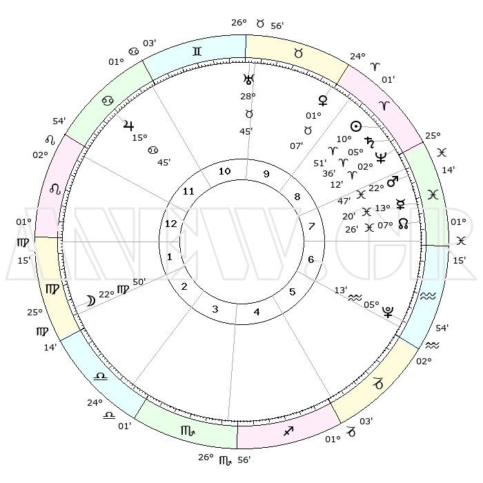 | | ΘΕΣΕΙΣ ΠΛΑΝΗΤΩΝ ΑΣΤΡΟΛΟΓΙΚΟΥ ΧΑΡΤΗ ΤΗΣ ΣΤΙΓΜΗΣ ΑΥΤΗΣ | | | | Πλανήτης | Ζώδιο | Μοίρες | Δεκαήμ. | Σε οίκο | Απόκλιση | | Ακμές των οίκων | | Ηλιος | Κριός | 10°47' | Δεύτερο | 9 | 04 N 16 | | 1ος | 13°43' | Λέων | | Σελήνη | Παρθένος | 22°03' | Τρίτο | 2 | 02 N 03 | | 2ος | 05°54' | Παρθένος | | Ερμής | Ιχθείς | 13°17' | Δεύτερο | 8 | 07 S 42 | | 3ος | 02°47' | Ζυγός | | Αφροδίτη | Ταύρος | 01°02' | Πρώτο | 9 | 11 N 24 | | 4ος | 05°07' | Σκορπιός | | Αρης | Ιχθείς | 22°44' | Τρίτο | 8 | 03 S 51 | | 5ος | 10°29' | Τοξότης | | Δίας | Καρκίνος | 15°45' | Δεύτερο | 12 | 22 N 52 | | 6ος | 14°08' | Αιγόκερως | | Κρόνος | Κριός | 05°36' | Πρώτο | 9 | 00 N 16 | | 7ος | 13°43' | Υδροχόος | | Ουρανός | Ταύρος | 28°45' | Τρίτο | 10 | 19 N 42 | | 8ος | 05°54' | Ιχθείς | | Ποσειδώνας | Κριός | 02°11' | Πρώτο | 8 | 00 S 20 | | 9ος | 02°47' | Κριός | | Πλούτωνας | Υδροχόος | 05°13' | Πρώτο | 6 | 22 S 47 | | 10ος | 05°07' | Ταύρος | | Β. Δεσμός | Ιχθείς | 07°26' | Πρώτο | 8 | 08 S 47 | | 11ος | 10°29' | Δίδυμοι | | Ωροσκόπος | Λέων | 13°43' | Δεύτερο | | | 12ος | 14°08' | Καρκίνος | | Μεσουράνημα | Ταύρος | 05°07' | Πρώτο | | | |
