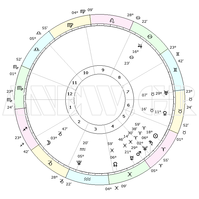 | | ΘΕΣΕΙΣ ΠΛΑΝΗΤΩΝ ΑΣΤΡΟΛΟΓΙΚΟΥ ΧΑΡΤΗ ΤΗΣ ΣΤΙΓΜΗΣ ΑΥΤΗΣ | | | | Πλανήτης | Ζώδιο | Μοίρες | Δεκαήμ. | Σε οίκο | Απόκλιση | | Ακμές των οίκων | | Ηλιος | Κριός | 18°55' | Δεύτερο | 6 | 07 N 24 | | 1ος | 03°53' | Σκορπιός | | Σελήνη | Αιγόκερως | 02°59' | Πρώτο | 2 | 28 S 05 | | 2ος | 02°32' | Τοξότης | | Ερμής | Ιχθείς | 21°41' | Τρίτο | 5 | 05 S 21 | | 3ος | 04°49' | Αιγόκερως | | Αφροδίτη | Ταύρος | 11°11' | Δεύτερο | 7 | 15 N 04 | | 4ος | 09°17' | Υδροχόος | | Αρης | Ιχθείς | 29°11' | Τρίτο | 5 | 01 S 15 | | 5ος | 12°08' | Ιχθείς | | Δίας | Καρκίνος | 16°22' | Δεύτερο | 9 | 22 N 48 | | 6ος | 10°26' | Κριός | | Κρόνος | Κριός | 06°37' | Πρώτο | 5 | 00 N 40 | | 7ος | 03°53' | Ταύρος | | Ουρανός | Ταύρος | 29°07' | Τρίτο | 7 | 19 N 47 | | 8ος | 02°32' | Δίδυμοι | | Ποσειδώνας | Κριός | 02°30' | Πρώτο | 5 | 00 S 13 | | 9ος | 04°49' | Καρκίνος | | Πλούτωνας | Υδροχόος | 05°20' | Πρώτο | 3 | 22 S 47 | | 10ος | 09°17' | Λέων | | Β. Δεσμός | Ιχθείς | 06°60' | Πρώτο | 4 | 08 S 57 | | 11ος | 12°08' | Παρθένος | | Ωροσκόπος | Σκορπιός | 03°53' | Πρώτο | | | 12ος | 10°26' | Ζυγός | | Μεσουράνημα | Λέων | 09°17' | Πρώτο | | | |