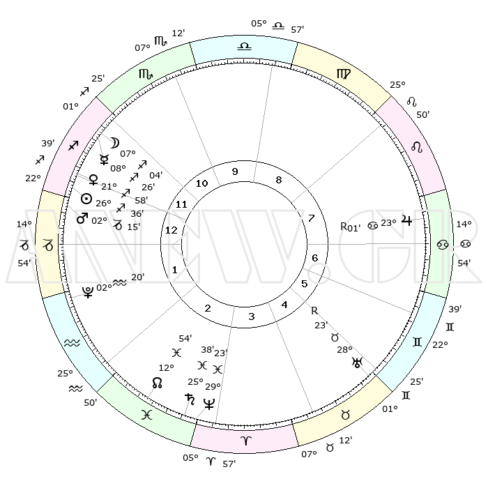 | | ΘΕΣΕΙΣ ΠΛΑΝΗΤΩΝ ΑΣΤΡΟΛΟΓΙΚΟΥ ΧΑΡΤΗ ΤΗΣ ΣΤΙΓΜΗΣ ΑΥΤΗΣ | | | | Πλανήτης | Ζώδιο | Μοίρες | Δεκαήμ. | Σε οίκο | Απόκλιση | | Ακμές των οίκων | | Ηλιος | Τοξότης | 26°16' | Τρίτο | 3 | 23 S 23 | | 1ος | 02°28' | Ζυγός | | Σελήνη | Τοξότης | 03°04' | Πρώτο | 3 | 25 S 36 | | 2ος | 29°14' | Ζυγός | | Ερμής | Τοξότης | 07°58' | Πρώτο | 3 | 20 S 29 | | 3ος | 29°46' | Σκορπιός | | Αφροδίτη | Τοξότης | 21°32' | Τρίτο | 3 | 23 S 07 | | 4ος | 02°47' | Αιγόκερως | | Αρης | Αιγόκερως | 02°00' | Πρώτο | 3 | 24 S 13 | | 5ος | 05°44' | Υδροχόος | | Δίας | Καρκίνος | 23°03'R | Τρίτο | 10 | 21 N 40 | | 6ος | 06°04' | Ιχθείς | | Κρόνος | Ιχθείς | 25°38' | Τρίτο | 6 | 03 S 51 | | 7ος | 02°28' | Κριός | | Ουρανός | Ταύρος | 28°23'R | Τρίτο | 8 | 19 N 36 | | 8ος | 29°14' | Κριός | | Ποσειδώνας | Ιχθείς | 29°23' | Τρίτο | 6 | 01 S 28 | | 9ος | 29°46' | Ταύρος | | Πλούτωνας | Υδροχόος | 02°19' | Πρώτο | 4 | 23 S 18 | | 10ος | 02°47' | Καρκίνος | | Β. Δεσμός | Ιχθείς | 12°55' | Δεύτερο | 6 | 06 S 43 | | 11ος | 05°44' | Λέων | | Ωροσκόπος | Ζυγός | 02°28' | Πρώτο | | | 12ος | 06°04' | Παρθένος | | Μεσουράνημα | Καρκίνος | 02°47' | Πρώτο | | | |