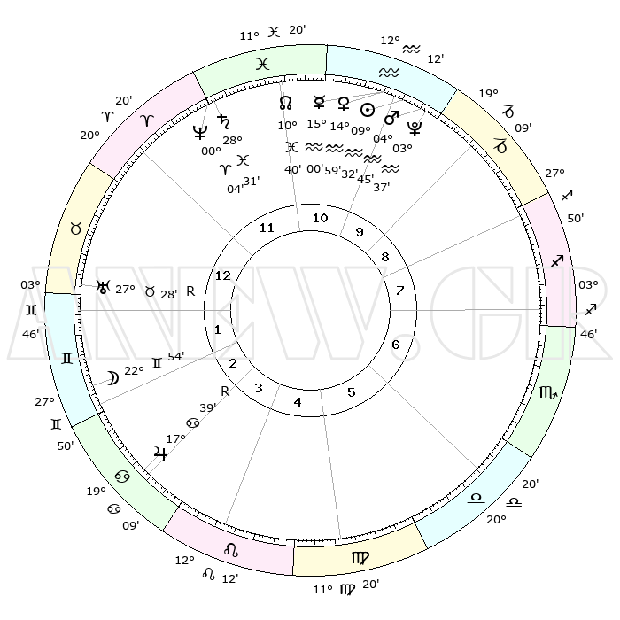 | | ΘΕΣΕΙΣ ΠΛΑΝΗΤΩΝ ΑΣΤΡΟΛΟΓΙΚΟΥ ΧΑΡΤΗ ΤΗΣ ΣΤΙΓΜΗΣ ΑΥΤΗΣ | | | | Πλανήτης | Ζώδιο | Μοίρες | Δεκαήμ. | Σε οίκο | Απόκλιση | | Ακμές των οίκων | | Ηλιος | Υδροχόος | 09°29' | Πρώτο | 10 | 17 S 53 | | 1ος | 03°56' | Ταύρος | | Σελήνη | Δίδυμοι | 21°58' | Τρίτο | 2 | 28 N 15 | | 2ος | 05°05' | Δίδυμοι | | Ερμής | Υδροχόος | 14°53' | Δεύτερο | 11 | 18 S 17 | | 3ος | 28°15' | Δίδυμοι | | Αφροδίτη | Υδροχόος | 14°55' | Δεύτερο | 11 | 17 S 37 | | 4ος | 19°58' | Καρκίνος | | Αρης | Υδροχόος | 04°42' | Πρώτο | 10 | 20 S 05 | | 5ος | 14°46' | Λέων | | Δίας | Καρκίνος | 17°39'R | Δεύτερο | 3 | 22 N 34 | | 6ος | 18°16' | Παρθένος | | Κρόνος | Ιχθείς | 28°30' | Τρίτο | 12 | 02 S 36 | | 7ος | 03°56' | Σκορπιός | | Ουρανός | Ταύρος | 27°28'R | Τρίτο | 1 | 19 N 24 | | 8ος | 05°05' | Τοξότης | | Ποσειδώνας | Κριός | 00°04' | Πρώτο | 12 | 01 S 11 | | 9ος | 28°15' | Τοξότης | | Πλούτωνας | Υδροχόος | 03°37' | Πρώτο | 10 | 23 S 02 | | 10ος | 19°58' | Αιγόκερως | | Β. Δεσμός | Ιχθείς | 10°40' | Δεύτερο | 11 | 07 S 34 | | 11ος | 14°46' | Υδροχόος | | Ωροσκόπος | Ταύρος | 03°56' | Πρώτο | | | 12ος | 18°16' | Ιχθείς | | Μεσουράνημα | Αιγόκερως | 19°58' | Δεύτερο | | | |