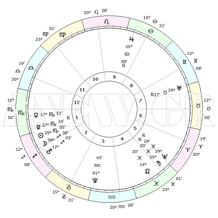 | | ΘΕΣΕΙΣ ΠΛΑΝΗΤΩΝ ΑΣΤΡΟΛΟΓΙΚΟΥ ΧΑΡΤΗ ΤΗΣ ΣΤΙΓΜΗΣ ΑΥΤΗΣ | | | | Πλανήτης | Ζώδιο | Μοίρες | Δεκαήμ. | Σε οίκο | Απόκλιση | | Ακμές των οίκων | | Ηλιος | Σκορπιός | 29°03' | Τρίτο | 1 | 19 S 56 | | 1ος | 01°34' | Σκορπιός | | Σελήνη | Τοξότης | 08°11' | Πρώτο | 2 | 26 S 34 | | 2ος | 00°04' | Τοξότης | | Ερμής | Σκορπιός | 27°19'R | Τρίτο | 1 | 18 S 47 | | 3ος | 02°09' | Αιγόκερως | | Αφροδίτη | Σκορπιός | 17°48' | Δεύτερο | 1 | 16 S 08 | | 4ος | 06°27' | Υδροχόος | | Αρης | Τοξότης | 12°01' | Δεύτερο | 2 | 22 S 48 | | 5ος | 09°21' | Ιχθείς | | Δίας | Καρκίνος | 25°00'R | Τρίτο | 9 | 21 N 15 | | 6ος | 07°52' | Κριός | | Κρόνος | Ιχθείς | 25°20'R | Τρίτο | 5 | 04 S 04 | | 7ος | 01°34' | Ταύρος | | Ουρανός | Ταύρος | 29°27'R | Τρίτο | 7 | 19 N 50 | | 8ος | 00°04' | Δίδυμοι | | Ποσειδώνας | Ιχθείς | 29°29'R | Τρίτο | 5 | 01 S 27 | | 9ος | 02°09' | Καρκίνος | | Πλούτωνας | Υδροχόος | 01°43' | Πρώτο | 3 | 23 S 27 | | 10ος | 06°27' | Λέων | | Β. Δεσμός | Ιχθείς | 14°20' | Δεύτερο | 5 | 06 S 10 | | 11ος | 09°21' | Παρθένος | | Ωροσκόπος | Σκορπιός | 01°34' | Πρώτο | | | 12ος | 07°52' | Ζυγός | | Μεσουράνημα | Λέων | 06°27' | Πρώτο | | | |