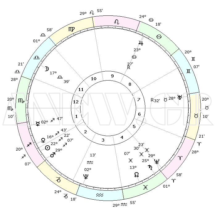 | | ΘΕΣΕΙΣ ΠΛΑΝΗΤΩΝ ΑΣΤΡΟΛΟΓΙΚΟΥ ΧΑΡΤΗ ΤΗΣ ΣΤΙΓΜΗΣ ΑΥΤΗΣ | | | | Πλανήτης | Ζώδιο | Μοίρες | Δεκαήμ. | Σε οίκο | Απόκλιση | | Ακμές των οίκων | | Ηλιος | Τοξότης | 22°13' | Τρίτο | 3 | 23 S 12 | | 1ος | 07°51' | Ζυγός | | Σελήνη | Ζυγός | 15°55' | Δεύτερο | 1 | 08 S 47 | | 2ος | 04°58' | Σκορπιός | | Ερμής | Τοξότης | 02°35' | Πρώτο | 2 | 19 S 02 | | 3ος | 05°42' | Τοξότης | | Αφροδίτη | Τοξότης | 16°32' | Δεύτερο | 3 | 22 S 33 | | 4ος | 08°50' | Αιγόκερως | | Αρης | Τοξότης | 29°00' | Τρίτο | 3 | 24 S 12 | | 5ος | 11°46' | Υδροχόος | | Δίας | Καρκίνος | 23°28'R | Τρίτο | 10 | 21 N 35 | | 6ος | 11°52' | Ιχθείς | | Κρόνος | Ιχθείς | 25°30' | Τρίτο | 6 | 03 S 55 | | 7ος | 07°51' | Κριός | | Ουρανός | Ταύρος | 28°32'R | Τρίτο | 8 | 19 N 38 | | 8ος | 04°58' | Ταύρος | | Ποσειδώνας | Ιχθείς | 29°23' | Τρίτο | 6 | 01 S 29 | | 9ος | 05°42' | Δίδυμοι | | Πλούτωνας | Υδροχόος | 02°13' | Πρώτο | 4 | 23 S 20 | | 10ος | 08°50' | Καρκίνος | | Β. Δεσμός | Ιχθείς | 13°07' | Δεύτερο | 6 | 06 S 38 | | 11ος | 11°46' | Λέων | | Ωροσκόπος | Ζυγός | 07°51' | Πρώτο | | | 12ος | 11°52' | Παρθένος | | Μεσουράνημα | Καρκίνος | 08°50' | Πρώτο | | | |