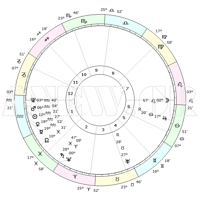 | | ΘΕΣΕΙΣ ΠΛΑΝΗΤΩΝ ΑΣΤΡΟΛΟΓΙΚΟΥ ΧΑΡΤΗ ΤΗΣ ΣΤΙΓΜΗΣ ΑΥΤΗΣ | | | | Πλανήτης | Ζώδιο | Μοίρες | Δεκαήμ. | Σε οίκο | Απόκλιση | | Ακμές των οίκων | | Ηλιος | Υδροχόος | 12°17' | Δεύτερο | 1 | 17 S 07 | | 1ος | 10°34' | Αιγόκερως | | Σελήνη | Λέων | 02°08' | Πρώτο | 7 | 22 N 45 | | 2ος | 20°26' | Υδροχόος | | Ερμής | Υδροχόος | 19°46' | Δεύτερο | 1 | 16 S 40 | | 3ος | 00°43' | Κριός | | Αφροδίτη | Υδροχόος | 18°23' | Δεύτερο | 1 | 16 S 37 | | 4ος | 02°47' | Ταύρος | | Αρης | Υδροχόος | 06°51' | Πρώτο | 1 | 19 S 34 | | 5ος | 27°33' | Ταύρος | | Δίας | Καρκίνος | 17°20'R | Δεύτερο | 7 | 22 N 37 | | 6ος | 18°52' | Δίδυμοι | | Κρόνος | Ιχθείς | 28°46' | Τρίτο | 2 | 02 S 29 | | 7ος | 10°34' | Καρκίνος | | Ουρανός | Ταύρος | 27°28'R | Τρίτο | 4 | 19 N 24 | | 8ος | 20°26' | Λέων | | Ποσειδώνας | Κριός | 00°09' | Πρώτο | 2 | 01 S 09 | | 9ος | 00°43' | Ζυγός | | Πλούτωνας | Υδροχόος | 03°42' | Πρώτο | 1 | 23 S 01 | | 10ος | 02°47' | Σκορπιός | | Β. Δεσμός | Ιχθείς | 10°31' | Δεύτερο | 2 | 07 S 37 | | 11ος | 27°33' | Σκορπιός | | Ωροσκόπος | Αιγόκερως | 10°34' | Δεύτερο | | | 12ος | 18°52' | Τοξότης | | Μεσουράνημα | Σκορπιός | 02°47' | Πρώτο | | | |