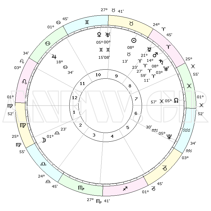 | | ΘΕΣΕΙΣ ΠΛΑΝΗΤΩΝ ΑΣΤΡΟΛΟΓΙΚΟΥ ΧΑΡΤΗ ΤΗΣ ΣΤΙΓΜΗΣ ΑΥΤΗΣ | | | | Πλανήτης | Ζώδιο | Μοίρες | Δεκαήμ. | Σε οίκο | Απόκλιση | | Ακμές των οίκων | | Ηλιος | Ταύρος | 08°09' | Πρώτο | 10 | 14 N 13 | | 1ος | 13°57' | Λέων | | Σελήνη | Ζυγός | 00°36' | Πρώτο | 2 | 02 S 05 | | 2ος | 06°09' | Παρθένος | | Ερμής | Κριός | 21°17' | Τρίτο | 9 | 06 N 17 | | 3ος | 03°03' | Ζυγός | | Αφροδίτη | Δίδυμοι | 05°11' | Πρώτο | 10 | 21 N 56 | | 4ος | 05°24' | Σκορπιός | | Αρης | Κριός | 14°24' | Δεύτερο | 9 | 04 N 51 | | 5ος | 10°45' | Τοξότης | | Δίας | Καρκίνος | 18°34' | Δεύτερο | 12 | 22 N 32 | | 6ος | 14°22' | Αιγόκερως | | Κρόνος | Κριός | 08°58' | Πρώτο | 9 | 01 N 34 | | 7ος | 13°57' | Υδροχόος | | Ουρανός | Δίδυμοι | 00°08' | Πρώτο | 10 | 20 N 01 | | 8ος | 06°09' | Ιχθείς | | Ποσειδώνας | Κριός | 03°11' | Πρώτο | 9 | 00 N 03 | | 9ος | 03°03' | Κριός | | Πλούτωνας | Υδροχόος | 05°30' | Πρώτο | 6 | 22 S 48 | | 10ος | 05°24' | Ταύρος | | Β. Δεσμός | Ιχθείς | 05°57' | Πρώτο | 7 | 09 S 20 | | 11ος | 10°45' | Δίδυμοι | | Ωροσκόπος | Λέων | 13°57' | Δεύτερο | | | 12ος | 14°22' | Καρκίνος | | Μεσουράνημα | Ταύρος | 05°24' | Πρώτο | | | |