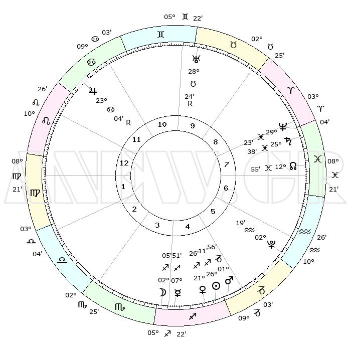 | | ΘΕΣΕΙΣ ΠΛΑΝΗΤΩΝ ΑΣΤΡΟΛΟΓΙΚΟΥ ΧΑΡΤΗ ΤΗΣ ΣΤΙΓΜΗΣ ΑΥΤΗΣ | | | | Πλανήτης | Ζώδιο | Μοίρες | Δεκαήμ. | Σε οίκο | Απόκλιση | | Ακμές των οίκων | | Ηλιος | Τοξότης | 26°05' | Τρίτο | 5 | 23 S 23 | | 1ος | 13°45' | Λέων | | Σελήνη | Τοξότης | 01°05' | Πρώτο | 4 | 25 S 10 | | 2ος | 05°55' | Παρθένος | | Ερμής | Τοξότης | 07°44' | Πρώτο | 4 | 20 S 26 | | 3ος | 02°48' | Ζυγός | | Αφροδίτη | Τοξότης | 21°20' | Τρίτο | 5 | 23 S 06 | | 4ος | 05°09' | Σκορπιός | | Αρης | Αιγόκερως | 01°53' | Πρώτο | 5 | 24 S 13 | | 5ος | 10°31' | Τοξότης | | Δίας | Καρκίνος | 23°04'R | Τρίτο | 12 | 21 N 40 | | 6ος | 14°09' | Αιγόκερως | | Κρόνος | Ιχθείς | 25°37' | Τρίτο | 8 | 03 S 52 | | 7ος | 13°45' | Υδροχόος | | Ουρανός | Ταύρος | 28°24'R | Τρίτο | 10 | 19 N 36 | | 8ος | 05°55' | Ιχθείς | | Ποσειδώνας | Ιχθείς | 29°23' | Τρίτο | 8 | 01 S 28 | | 9ος | 02°48' | Κριός | | Πλούτωνας | Υδροχόος | 02°19' | Πρώτο | 6 | 23 S 18 | | 10ος | 05°09' | Ταύρος | | Β. Δεσμός | Ιχθείς | 12°55' | Δεύτερο | 8 | 06 S 42 | | 11ος | 10°31' | Δίδυμοι | | Ωροσκόπος | Λέων | 13°45' | Δεύτερο | | | 12ος | 14°09' | Καρκίνος | | Μεσουράνημα | Ταύρος | 05°09' | Πρώτο | | | |