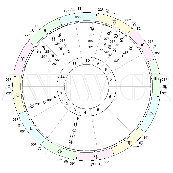 | | ΘΕΣΕΙΣ ΠΛΑΝΗΤΩΝ ΑΣΤΡΟΛΟΓΙΚΟΥ ΧΑΡΤΗ ΤΗΣ ΣΤΙΓΜΗΣ ΑΥΤΗΣ | | | | Πλανήτης | Ζώδιο | Μοίρες | Δεκαήμ. | Σε οίκο | Απόκλιση | | Ακμές των οίκων | | Ηλιος | Αιγόκερως | 03°52' | Πρώτο | 10 | 23 S 23 | | 1ος | 26°08' | Ιχθείς | | Σελήνη | Ιχθείς | 04°44' | Πρώτο | 12 | 10 S 19 | | 2ος | 07°20' | Ταύρος | | Ερμής | Τοξότης | 18°45' | Δεύτερο | 9 | 22 S 45 | | 3ος | 05°20' | Δίδυμοι | | Αφροδίτη | Αιγόκερως | 00°56' | Πρώτο | 10 | 23 S 41 | | 4ος | 27°50' | Δίδυμοι | | Αρης | Αιγόκερως | 07°40' | Πρώτο | 10 | 24 S 03 | | 5ος | 19°58' | Καρκίνος | | Δίας | Καρκίνος | 22°11'R | Τρίτο | 5 | 21 N 50 | | 6ος | 16°48' | Λέων | | Κρόνος | Ιχθείς | 25°56' | Τρίτο | 12 | 03 S 43 | | 7ος | 26°08' | Παρθένος | | Ουρανός | Ταύρος | 28°08'R | Τρίτο | 2 | 19 N 33 | | 8ος | 07°20' | Σκορπιός | | Ποσειδώνας | Ιχθείς | 29°26' | Τρίτο | 1 | 01 S 27 | | 9ος | 05°20' | Τοξότης | | Πλούτωνας | Υδροχόος | 02°32' | Πρώτο | 11 | 23 S 16 | | 10ος | 27°50' | Τοξότης | | Β. Δεσμός | Ιχθείς | 12°31' | Δεύτερο | 12 | 06 S 52 | | 11ος | 19°58' | Αιγόκερως | | Ωροσκόπος | Ιχθείς | 26°08' | Τρίτο | | | 12ος | 16°48' | Υδροχόος | | Μεσουράνημα | Τοξότης | 27°50' | Τρίτο | | | |