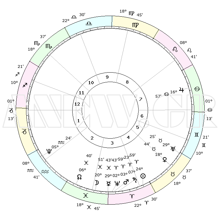 | | ΘΕΣΕΙΣ ΠΛΑΝΗΤΩΝ ΑΣΤΡΟΛΟΓΙΚΟΥ ΧΑΡΤΗ ΤΗΣ ΣΤΙΓΜΗΣ ΑΥΤΗΣ | | | | Πλανήτης | Ζώδιο | Μοίρες | Δεκαήμ. | Σε οίκο | Απόκλιση | | Ακμές των οίκων | | Ηλιος | Κριός | 24°54' | Τρίτο | 5 | 09 N 38 | | 1ος | 06°57' | Τοξότης | | Σελήνη | Ιχθείς | 19°46' | Δεύτερο | 3 | 03 S 05 | | 2ος | 09°08' | Αιγόκερως | | Ερμής | Ιχθείς | 29°36' | Τρίτο | 4 | 02 S 32 | | 3ος | 16°01' | Υδροχόος | | Αφροδίτη | Ταύρος | 18°39' | Δεύτερο | 6 | 17 N 32 | | 4ος | 22°05' | Ιχθείς | | Αρης | Κριός | 03°55' | Πρώτο | 4 | 00 N 39 | | 5ος | 22°10' | Κριός | | Δίας | Καρκίνος | 16°57' | Δεύτερο | 8 | 22 N 44 | | 6ος | 16°18' | Ταύρος | | Κρόνος | Κριός | 07°22' | Πρώτο | 4 | 00 N 57 | | 7ος | 06°57' | Δίδυμοι | | Ουρανός | Ταύρος | 29°25' | Τρίτο | 6 | 19 N 51 | | 8ος | 09°08' | Καρκίνος | | Ποσειδώνας | Κριός | 02°43' | Πρώτο | 4 | 00 S 07 | | 9ος | 16°01' | Λέων | | Πλούτωνας | Υδροχόος | 05°24' | Πρώτο | 2 | 22 S 47 | | 10ος | 22°05' | Παρθένος | | Β. Δεσμός | Ιχθείς | 06°40' | Πρώτο | 3 | 09 S 04 | | 11ος | 22°10' | Ζυγός | | Ωροσκόπος | Τοξότης | 06°57' | Πρώτο | | | 12ος | 16°18' | Σκορπιός | | Μεσουράνημα | Παρθένος | 22°05' | Τρίτο | | | |