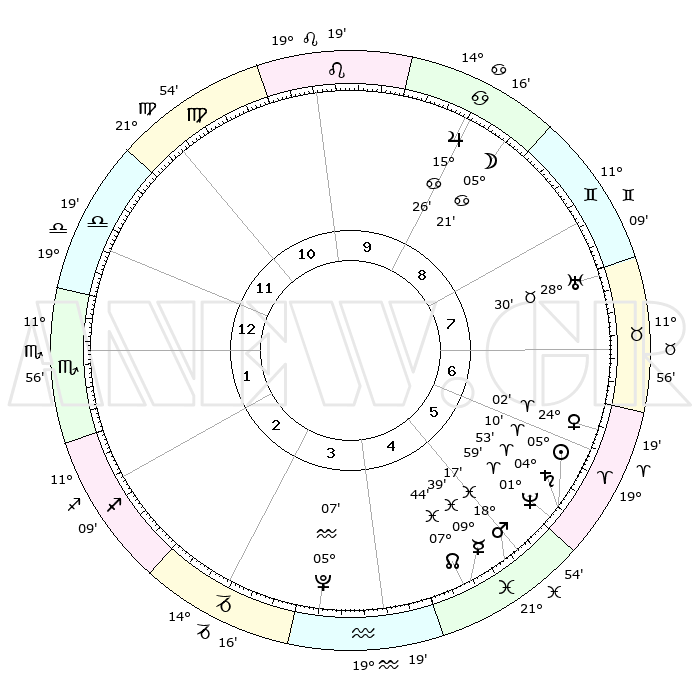 | | ΘΕΣΕΙΣ ΠΛΑΝΗΤΩΝ ΑΣΤΡΟΛΟΓΙΚΟΥ ΧΑΡΤΗ ΤΗΣ ΣΤΙΓΜΗΣ ΑΥΤΗΣ | | | | Πλανήτης | Ζώδιο | Μοίρες | Δεκαήμ. | Σε οίκο | Απόκλιση | | Ακμές των οίκων | | Ηλιος | Κριός | 05°06' | Πρώτο | 6 | 02 N 02 | | 1ος | 22°08' | Ζυγός | | Σελήνη | Καρκίνος | 04°24' | Πρώτο | 9 | 28 N 04 | | 2ος | 20°06' | Σκορπιός | | Ερμής | Ιχθείς | 09°37' | Πρώτο | 5 | 08 S 06 | | 3ος | 21°31' | Τοξότης | | Αφροδίτη | Κριός | 23°57' | Τρίτο | 7 | 08 N 39 | | 4ος | 25°13' | Αιγόκερως | | Αρης | Ιχθείς | 18°14' | Δεύτερο | 5 | 05 S 38 | | 5ος | 28°10' | Υδροχόος | | Δίας | Καρκίνος | 15°26' | Δεύτερο | 9 | 22 N 54 | | 6ος | 27°29' | Ιχθείς | | Κρόνος | Κριός | 04°53' | Πρώτο | 6 | 00 S 01 | | 7ος | 22°08' | Κριός | | Ουρανός | Ταύρος | 28°30' | Τρίτο | 8 | 19 N 39 | | 8ος | 20°06' | Ταύρος | | Ποσειδώνας | Κριός | 01°58' | Πρώτο | 6 | 00 S 25 | | 9ος | 21°31' | Δίδυμοι | | Πλούτωνας | Υδροχόος | 05°07' | Πρώτο | 4 | 22 S 48 | | 10ος | 25°13' | Καρκίνος | | Β. Δεσμός | Ιχθείς | 07°44' | Πρώτο | 5 | 08 S 40 | | 11ος | 28°10' | Λέων | | Ωροσκόπος | Ζυγός | 22°08' | Τρίτο | | | 12ος | 27°29' | Παρθένος | | Μεσουράνημα | Καρκίνος | 25°13' | Τρίτο | | | |