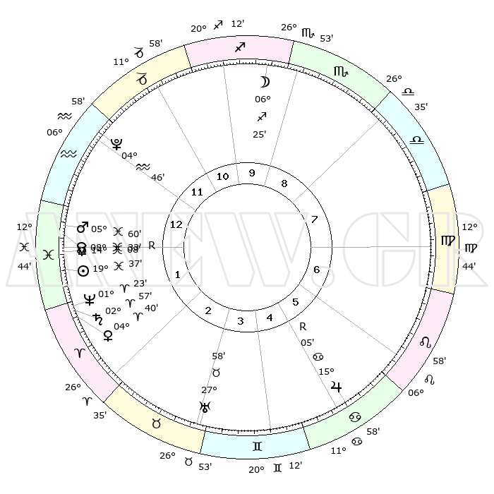 | | ΘΕΣΕΙΣ ΠΛΑΝΗΤΩΝ ΑΣΤΡΟΛΟΓΙΚΟΥ ΧΑΡΤΗ ΤΗΣ ΣΤΙΓΜΗΣ ΑΥΤΗΣ | | | | Πλανήτης | Ζώδιο | Μοίρες | Δεκαήμ. | Σε οίκο | Απόκλιση | | Ακμές των οίκων | | Ηλιος | Ιχθείς | 19°33' | Δεύτερο | 1 | 04 S 08 | | 1ος | 10°06' | Υδροχόος | | Σελήνη | Τοξότης | 05°40' | Πρώτο | 10 | 26 S 26 | | 2ος | 25°29' | Ιχθείς | | Ερμής | Ιχθείς | 14°12'R | Δεύτερο | 1 | 03 S 06 | | 3ος | 02°09' | Ταύρος | | Αφροδίτη | Κριός | 04°35' | Πρώτο | 2 | 00 N 44 | | 4ος | 28°59' | Ταύρος | | Αρης | Ιχθείς | 05°57' | Πρώτο | 1 | 10 S 21 | | 5ος | 21°09' | Δίδυμοι | | Δίας | Καρκίνος | 15°05'R | Δεύτερο | 6 | 22 N 56 | | 6ος | 13°04' | Καρκίνος | | Κρόνος | Κριός | 02°57' | Πρώτο | 2 | 00 S 47 | | 7ος | 10°06' | Λέων | | Ουρανός | Ταύρος | 27°58' | Τρίτο | 3 | 19 N 32 | | 8ος | 25°28' | Παρθένος | | Ποσειδώνας | Κριός | 01°23' | Πρώτο | 2 | 00 S 39 | | 9ος | 02°09' | Σκορπιός | | Πλούτωνας | Υδροχόος | 04°46' | Πρώτο | 12 | 22 S 50 | | 10ος | 28°59' | Σκορπιός | | Β. Δεσμός | Ιχθείς | 08°34' | Πρώτο | 1 | 08 S 21 | | 11ος | 21°09' | Τοξότης | | Ωροσκόπος | Υδροχόος | 10°06' | Δεύτερο | | | 12ος | 13°04' | Αιγόκερως | | Μεσουράνημα | Σκορπιός | 28°59' | Τρίτο | | | |