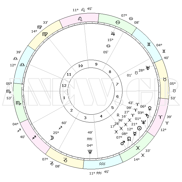 | | ΘΕΣΕΙΣ ΠΛΑΝΗΤΩΝ ΑΣΤΡΟΛΟΓΙΚΟΥ ΧΑΡΤΗ ΤΗΣ ΣΤΙΓΜΗΣ ΑΥΤΗΣ | | | | Πλανήτης | Ζώδιο | Μοίρες | Δεκαήμ. | Σε οίκο | Απόκλιση | | Ακμές των οίκων | | Ηλιος | Ιχθείς | 21°12' | Τρίτο | 5 | 03 S 29 | | 1ος | 17°51' | Ζυγός | | Σελήνη | Τοξότης | 25°16' | Τρίτο | 3 | 28 S 24 | | 2ος | 15°34' | Σκορπιός | | Ερμής | Ιχθείς | 12°39'R | Δεύτερο | 5 | 03 S 57 | | 3ος | 16°45' | Τοξότης | | Αφροδίτη | Κριός | 06°38' | Πρώτο | 6 | 01 N 35 | | 4ος | 20°14' | Αιγόκερως | | Αρης | Ιχθείς | 07°14' | Πρώτο | 5 | 09 S 52 | | 5ος | 23°11' | Υδροχόος | | Δίας | Καρκίνος | 15°05' | Δεύτερο | 9 | 22 N 56 | | 6ος | 22°47' | Ιχθείς | | Κρόνος | Κριός | 03°09' | Πρώτο | 6 | 00 S 42 | | 7ος | 17°51' | Κριός | | Ουρανός | Ταύρος | 28°01' | Τρίτο | 8 | 19 N 32 | | 8ος | 15°35' | Ταύρος | | Ποσειδώνας | Κριός | 01°27' | Πρώτο | 6 | 00 S 37 | | 9ος | 16°45' | Δίδυμοι | | Πλούτωνας | Υδροχόος | 04°49' | Πρώτο | 4 | 22 S 50 | | 10ος | 20°14' | Καρκίνος | | Β. Δεσμός | Ιχθείς | 08°28' | Πρώτο | 5 | 08 S 23 | | 11ος | 23°11' | Λέων | | Ωροσκόπος | Ζυγός | 17°51' | Δεύτερο | | | 12ος | 22°47' | Παρθένος | | Μεσουράνημα | Καρκίνος | 20°14' | Τρίτο | | | |