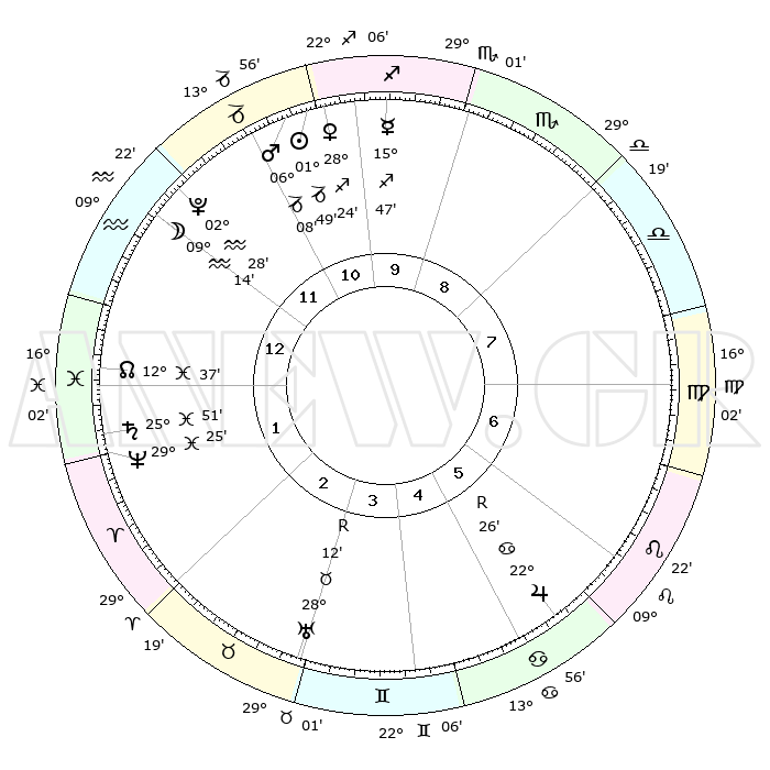 | | ΘΕΣΕΙΣ ΠΛΑΝΗΤΩΝ ΑΣΤΡΟΛΟΓΙΚΟΥ ΧΑΡΤΗ ΤΗΣ ΣΤΙΓΜΗΣ ΑΥΤΗΣ | | | | Πλανήτης | Ζώδιο | Μοίρες | Δεκαήμ. | Σε οίκο | Απόκλιση | | Ακμές των οίκων | | Ηλιος | Αιγόκερως | 01°44' | Πρώτο | 11 | 23 S 25 | | 1ος | 04°48' | Υδροχόος | | Σελήνη | Υδροχόος | 08°14' | Πρώτο | 1 | 20 S 52 | | 2ος | 19°37' | Ιχθείς | | Ερμής | Τοξότης | 15°40' | Δεύτερο | 10 | 22 S 12 | | 3ος | 27°16' | Κριός | | Αφροδίτη | Τοξότης | 28°18' | Τρίτο | 11 | 23 S 35 | | 4ος | 24°55' | Ταύρος | | Αρης | Αιγόκερως | 06°04' | Πρώτο | 11 | 24 S 08 | | 5ος | 17°22' | Δίδυμοι | | Δίας | Καρκίνος | 22°26'R | Τρίτο | 6 | 21 N 47 | | 6ος | 08°59' | Καρκίνος | | Κρόνος | Ιχθείς | 25°50' | Τρίτο | 2 | 03 S 45 | | 7ος | 04°48' | Λέων | | Ουρανός | Ταύρος | 28°12'R | Τρίτο | 4 | 19 N 34 | | 8ος | 19°37' | Παρθένος | | Ποσειδώνας | Ιχθείς | 29°25' | Τρίτο | 2 | 01 S 27 | | 9ος | 27°16' | Ζυγός | | Πλούτωνας | Υδροχόος | 02°28' | Πρώτο | 12 | 23 S 16 | | 10ος | 24°55' | Σκορπιός | | Β. Δεσμός | Ιχθείς | 12°38' | Δεύτερο | 1 | 06 S 49 | | 11ος | 17°22' | Τοξότης | | Ωροσκόπος | Υδροχόος | 04°48' | Πρώτο | | | 12ος | 08°59' | Αιγόκερως | | Μεσουράνημα | Σκορπιός | 24°55' | Τρίτο | | | |