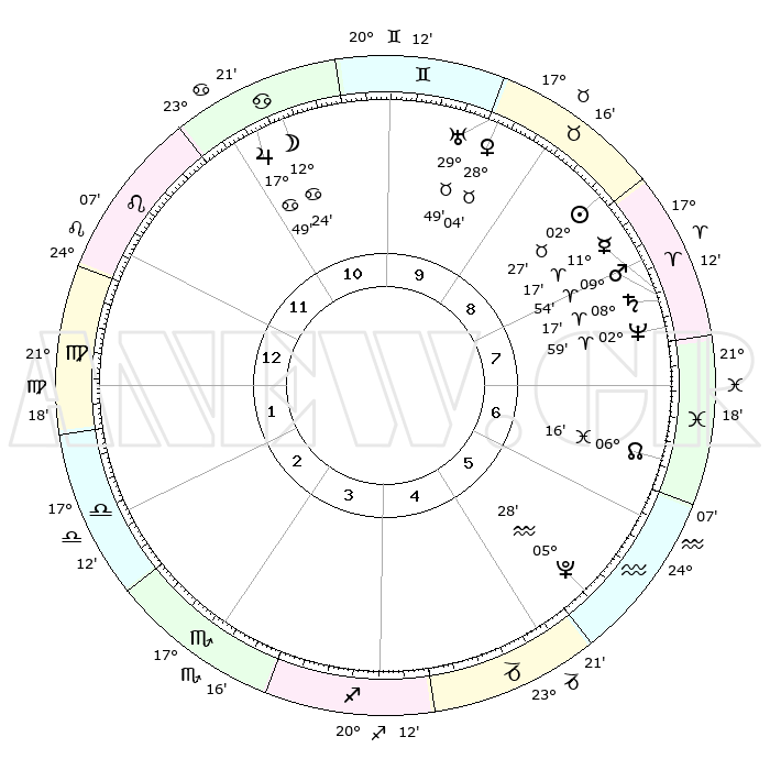 | | ΘΕΣΕΙΣ ΠΛΑΝΗΤΩΝ ΑΣΤΡΟΛΟΓΙΚΟΥ ΧΑΡΤΗ ΤΗΣ ΣΤΙΓΜΗΣ ΑΥΤΗΣ | | | | Πλανήτης | Ζώδιο | Μοίρες | Δεκαήμ. | Σε οίκο | Απόκλιση | | Ακμές των οίκων | | Ηλιος | Ταύρος | 02°23' | Πρώτο | 9 | 12 N 18 | | 1ος | 02°34' | Παρθένος | | Σελήνη | Καρκίνος | 11°30' | Δεύτερο | 11 | 27 N 09 | | 2ος | 26°41' | Παρθένος | | Ερμής | Κριός | 11°11' | Δεύτερο | 8 | 02 N 04 | | 3ος | 25°35' | Ζυγός | | Αφροδίτη | Ταύρος | 27°59' | Τρίτο | 9 | 20 N 13 | | 4ος | 28°31' | Σκορπιός | | Αρης | Κριός | 09°51' | Πρώτο | 8 | 03 N 02 | | 5ος | 02°32' | Αιγόκερως | | Δίας | Καρκίνος | 17°49' | Δεύτερο | 11 | 22 N 38 | | 6ος | 04°18' | Υδροχόος | | Κρόνος | Κριός | 08°17' | Πρώτο | 8 | 01 N 18 | | 7ος | 02°34' | Ιχθείς | | Ουρανός | Ταύρος | 29°49' | Τρίτο | 10 | 19 N 57 | | 8ος | 26°41' | Ιχθείς | | Ποσειδώνας | Κριός | 02°59' | Πρώτο | 8 | 00 S 01 | | 9ος | 25°35' | Κριός | | Πλούτωνας | Υδροχόος | 05°28' | Πρώτο | 6 | 22 S 48 | | 10ος | 28°31' | Ταύρος | | Β. Δεσμός | Ιχθείς | 06°16' | Πρώτο | 7 | 09 S 13 | | 11ος | 02°32' | Καρκίνος | | Ωροσκόπος | Παρθένος | 02°34' | Πρώτο | | | 12ος | 04°18' | Λέων | | Μεσουράνημα | Ταύρος | 28°31' | Τρίτο | | | |