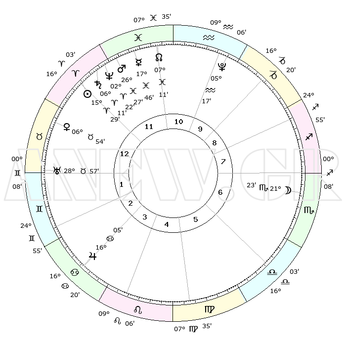 | | ΘΕΣΕΙΣ ΠΛΑΝΗΤΩΝ ΑΣΤΡΟΛΟΓΙΚΟΥ ΧΑΡΤΗ ΤΗΣ ΣΤΙΓΜΗΣ ΑΥΤΗΣ | | | | Πλανήτης | Ζώδιο | Μοίρες | Δεκαήμ. | Σε οίκο | Απόκλιση | | Ακμές των οίκων | | Ηλιος | Κριός | 15°14' | Δεύτερο | 3 | 06 N 00 | | 1ος | 19°33' | Αιγόκερως | | Σελήνη | Σκορπιός | 18°18' | Δεύτερο | 10 | 21 S 56 | | 2ος | 01°34' | Ιχθείς | | Ερμής | Ιχθείς | 17°30' | Δεύτερο | 2 | 06 S 39 | | 3ος | 11°21' | Κριός | | Αφροδίτη | Ταύρος | 06°35' | Πρώτο | 3 | 13 N 27 | | 4ος | 11°43' | Ταύρος | | Αρης | Ιχθείς | 26°16' | Τρίτο | 2 | 02 S 26 | | 5ος | 05°24' | Δίδυμοι | | Δίας | Καρκίνος | 16°04' | Δεύτερο | 6 | 22 N 50 | | 6ος | 26°37' | Δίδυμοι | | Κρόνος | Κριός | 06°10' | Πρώτο | 2 | 00 N 29 | | 7ος | 19°33' | Καρκίνος | | Ουρανός | Ταύρος | 28°57' | Τρίτο | 4 | 19 N 45 | | 8ος | 01°34' | Παρθένος | | Ποσειδώνας | Κριός | 02°22' | Πρώτο | 2 | 00 S 16 | | 9ος | 11°21' | Ζυγός | | Πλούτωνας | Υδροχόος | 05°17' | Πρώτο | 1 | 22 S 47 | | 10ος | 11°43' | Σκορπιός | | Β. Δεσμός | Ιχθείς | 07°11' | Πρώτο | 2 | 08 S 52 | | 11ος | 05°24' | Τοξότης | | Ωροσκόπος | Αιγόκερως | 19°33' | Δεύτερο | | | 12ος | 26°37' | Τοξότης | | Μεσουράνημα | Σκορπιός | 11°43' | Δεύτερο | | | |