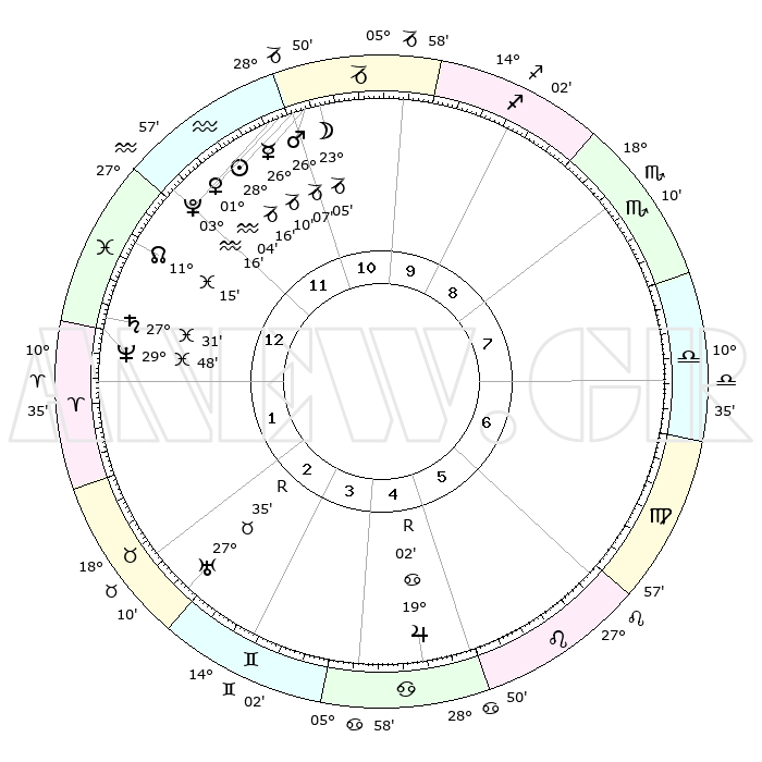 | | ΘΕΣΕΙΣ ΠΛΑΝΗΤΩΝ ΑΣΤΡΟΛΟΓΙΚΟΥ ΧΑΡΤΗ ΤΗΣ ΣΤΙΓΜΗΣ ΑΥΤΗΣ | | | | Πλανήτης | Ζώδιο | Μοίρες | Δεκαήμ. | Σε οίκο | Απόκλιση | | Ακμές των οίκων | | Ηλιος | Αιγόκερως | 28°12' | Τρίτο | 11 | 20 S 31 | | 1ος | 01°17' | Ιχθείς | | Σελήνη | Αιγόκερως | 22°15' | Τρίτο | 11 | 25 S 20 | | 2ος | 16°36' | Κριός | | Ερμής | Αιγόκερως | 26°03' | Τρίτο | 11 | 22 S 51 | | 3ος | 19°04' | Ταύρος | | Αφροδίτη | Υδροχόος | 00°59' | Πρώτο | 12 | 20 S 59 | | 4ος | 13°20' | Δίδυμοι | | Αρης | Αιγόκερως | 26°03' | Τρίτο | 11 | 21 S 54 | | 5ος | 05°01' | Καρκίνος | | Δίας | Καρκίνος | 19°02'R | Δεύτερο | 5 | 22 N 21 | | 6ος | 28°43' | Καρκίνος | | Κρόνος | Ιχθείς | 27°31' | Τρίτο | 1 | 03 S 01 | | 7ος | 01°17' | Παρθένος | | Ουρανός | Ταύρος | 27°35'R | Τρίτο | 3 | 19 N 26 | | 8ος | 16°36' | Ζυγός | | Ποσειδώνας | Ιχθείς | 29°48' | Τρίτο | 1 | 01 S 17 | | 9ος | 19°04' | Σκορπιός | | Πλούτωνας | Υδροχόος | 03°16' | Πρώτο | 12 | 23 S 06 | | 10ος | 13°20' | Τοξότης | | Β. Δεσμός | Ιχθείς | 11°15' | Δεύτερο | 1 | 07 S 21 | | 11ος | 05°01' | Αιγόκερως | | Ωροσκόπος | Ιχθείς | 01°17' | Πρώτο | | | 12ος | 28°43' | Αιγόκερως | | Μεσουράνημα | Τοξότης | 13°20' | Δεύτερο | | | |