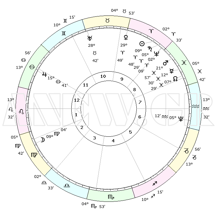 | | ΘΕΣΕΙΣ ΠΛΑΝΗΤΩΝ ΑΣΤΡΟΛΟΓΙΚΟΥ ΧΑΡΤΗ ΤΗΣ ΣΤΙΓΜΗΣ ΑΥΤΗΣ | | | | Πλανήτης | Ζώδιο | Μοίρες | Δεκαήμ. | Σε οίκο | Απόκλιση | | Ακμές των οίκων | | Ηλιος | Κριός | 09°44' | Πρώτο | 10 | 03 N 51 | | 1ος | 20°10' | Καρκίνος | | Σελήνη | Παρθένος | 08°01' | Πρώτο | 3 | 08 N 37 | | 2ος | 10°43' | Λέων | | Ερμής | Ιχθείς | 12°26' | Δεύτερο | 9 | 07 S 51 | | 3ος | 04°28' | Παρθένος | | Αφροδίτη | Κριός | 29°43' | Τρίτο | 10 | 10 N 54 | | 4ος | 04°07' | Ζυγός | | Αρης | Ιχθείς | 21°54' | Τρίτο | 9 | 04 S 11 | | 5ος | 10°07' | Σκορπιός | | Δίας | Καρκίνος | 15°41' | Δεύτερο | 12 | 22 N 53 | | 6ος | 17°28' | Τοξότης | | Κρόνος | Κριός | 05°28' | Πρώτο | 10 | 00 N 13 | | 7ος | 20°10' | Αιγόκερως | | Ουρανός | Ταύρος | 28°42' | Τρίτο | 11 | 19 N 42 | | 8ος | 10°43' | Υδροχόος | | Ποσειδώνας | Κριός | 02°09' | Πρώτο | 9 | 00 S 21 | | 9ος | 04°28' | Ιχθείς | | Πλούτωνας | Υδροχόος | 05°11' | Πρώτο | 7 | 22 S 48 | | 10ος | 04°07' | Κριός | | Β. Δεσμός | Ιχθείς | 07°29' | Πρώτο | 9 | 08 S 45 | | 11ος | 10°07' | Ταύρος | | Ωροσκόπος | Καρκίνος | 20°10' | Τρίτο | | | 12ος | 17°28' | Δίδυμοι | | Μεσουράνημα | Κριός | 04°07' | Πρώτο | | | |