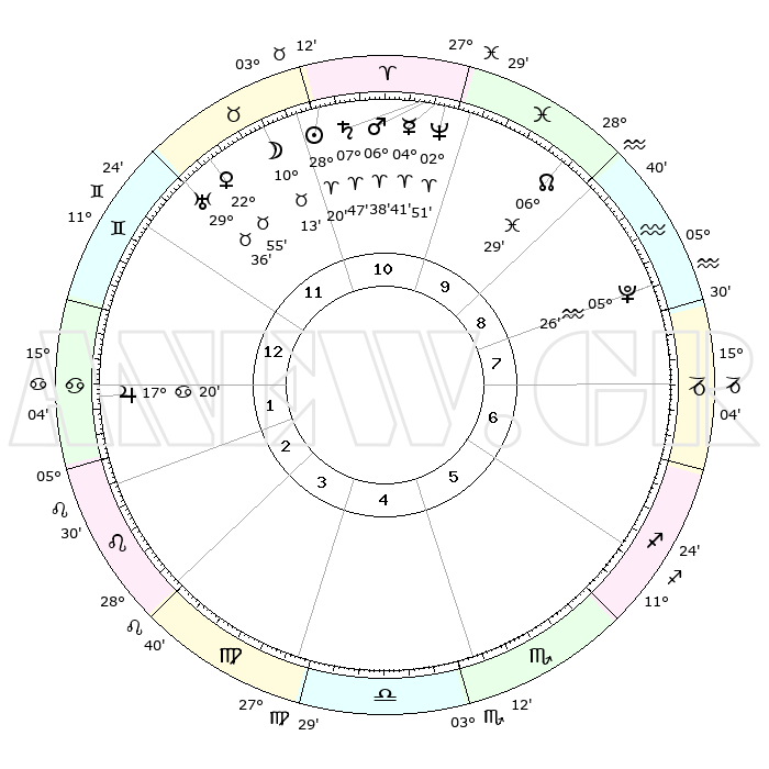 | | ΘΕΣΕΙΣ ΠΛΑΝΗΤΩΝ ΑΣΤΡΟΛΟΓΙΚΟΥ ΧΑΡΤΗ ΤΗΣ ΣΤΙΓΜΗΣ ΑΥΤΗΣ | | | | Πλανήτης | Ζώδιο | Μοίρες | Δεκαήμ. | Σε οίκο | Απόκλιση | | Ακμές των οίκων | | Ηλιος | Κριός | 28°29' | Τρίτο | 9 | 10 N 56 | | 1ος | 02°00' | Παρθένος | | Σελήνη | Ταύρος | 12°36' | Δεύτερο | 9 | 20 N 01 | | 2ος | 26°04' | Παρθένος | | Ερμής | Κριός | 04°56' | Πρώτο | 8 | 00 S 28 | | 3ος | 24°55' | Ζυγός | | Αφροδίτη | Ταύρος | 23°07' | Τρίτο | 9 | 18 N 52 | | 4ος | 27°51' | Σκορπιός | | Αρης | Κριός | 06°46' | Πρώτο | 8 | 01 N 48 | | 5ος | 01°55' | Αιγόκερως | | Δίας | Καρκίνος | 17°21' | Δεύτερο | 11 | 22 N 41 | | 6ος | 03°43' | Υδροχόος | | Κρόνος | Κριός | 07°48' | Πρώτο | 8 | 01 N 07 | | 7ος | 02°00' | Ιχθείς | | Ουρανός | Ταύρος | 29°36' | Τρίτο | 10 | 19 N 54 | | 8ος | 26°04' | Ιχθείς | | Ποσειδώνας | Κριός | 02°51' | Πρώτο | 8 | 00 S 04 | | 9ος | 24°55' | Κριός | | Πλούτωνας | Υδροχόος | 05°26' | Πρώτο | 6 | 22 S 47 | | 10ος | 27°51' | Ταύρος | | Β. Δεσμός | Ιχθείς | 06°29' | Πρώτο | 7 | 09 S 08 | | 11ος | 01°55' | Καρκίνος | | Ωροσκόπος | Παρθένος | 02°00' | Πρώτο | | | 12ος | 03°43' | Λέων | | Μεσουράνημα | Ταύρος | 27°51' | Τρίτο | | | |