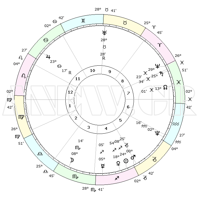 | | ΘΕΣΕΙΣ ΠΛΑΝΗΤΩΝ ΑΣΤΡΟΛΟΓΙΚΟΥ ΧΑΡΤΗ ΤΗΣ ΣΤΙΓΜΗΣ ΑΥΤΗΣ | | | | Πλανήτης | Ζώδιο | Μοίρες | Δεκαήμ. | Σε οίκο | Απόκλιση | | Ακμές των οίκων | | Ηλιος | Τοξότης | 23°46' | Τρίτο | 9 | 23 S 17 | | 1ος | 26°30' | Κριός | | Σελήνη | Σκορπιός | 03°58' | Πρώτο | 7 | 16 S 31 | | 2ος | 29°41' | Ταύρος | | Ερμής | Τοξότης | 04°36' | Πρώτο | 8 | 19 S 36 | | 3ος | 23°37' | Δίδυμοι | | Αφροδίτη | Τοξότης | 18°27' | Δεύτερο | 8 | 22 S 47 | | 4ος | 15°18' | Καρκίνος | | Αρης | Αιγόκερως | 00°09' | Πρώτο | 9 | 24 S 13 | | 5ος | 09°22' | Λέων | | Δίας | Καρκίνος | 23°19'R | Τρίτο | 4 | 21 N 37 | | 6ος | 11°24' | Παρθένος | | Κρόνος | Ιχθείς | 25°33' | Τρίτο | 12 | 03 S 54 | | 7ος | 26°30' | Ζυγός | | Ουρανός | Ταύρος | 28°29'R | Τρίτο | 1 | 19 N 37 | | 8ος | 29°41' | Σκορπιός | | Ποσειδώνας | Ιχθείς | 29°23' | Τρίτο | 12 | 01 S 29 | | 9ος | 23°37' | Τοξότης | | Πλούτωνας | Υδροχόος | 02°15' | Πρώτο | 10 | 23 S 19 | | 10ος | 15°18' | Αιγόκερως | | Β. Δεσμός | Ιχθείς | 13°03' | Δεύτερο | 12 | 06 S 40 | | 11ος | 09°22' | Υδροχόος | | Ωροσκόπος | Κριός | 26°30' | Τρίτο | | | 12ος | 11°24' | Ιχθείς | | Μεσουράνημα | Αιγόκερως | 15°18' | Δεύτερο | | | |