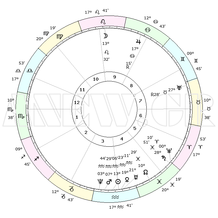 | | ΘΕΣΕΙΣ ΠΛΑΝΗΤΩΝ ΑΣΤΡΟΛΟΓΙΚΟΥ ΧΑΡΤΗ ΤΗΣ ΣΤΙΓΜΗΣ ΑΥΤΗΣ | | | | Πλανήτης | Ζώδιο | Μοίρες | Δεκαήμ. | Σε οίκο | Απόκλιση | | Ακμές των οίκων | | Ηλιος | Υδροχόος | 13°02' | Δεύτερο | 4 | 16 S 54 | | 1ος | 21°02' | Ζυγός | | Σελήνη | Λέων | 12°35' | Δεύτερο | 10 | 19 N 16 | | 2ος | 18°56' | Σκορπιός | | Ερμής | Υδροχόος | 21°04' | Τρίτο | 4 | 16 S 12 | | 3ος | 20°17' | Τοξότης | | Αφροδίτη | Υδροχόος | 19°18' | Δεύτερο | 4 | 16 S 20 | | 4ος | 23°55' | Αιγόκερως | | Αρης | Υδροχόος | 07°26' | Πρώτο | 4 | 19 S 25 | | 5ος | 26°53' | Υδροχόος | | Δίας | Καρκίνος | 17°15'R | Δεύτερο | 9 | 22 N 37 | | 6ος | 26°15' | Ιχθείς | | Κρόνος | Ιχθείς | 28°51' | Τρίτο | 6 | 02 S 27 | | 7ος | 21°02' | Κριός | | Ουρανός | Ταύρος | 27°28'R | Τρίτο | 8 | 19 N 24 | | 8ος | 18°56' | Ταύρος | | Ποσειδώνας | Κριός | 00°10' | Πρώτο | 6 | 01 S 08 | | 9ος | 20°17' | Δίδυμοι | | Πλούτωνας | Υδροχόος | 03°44' | Πρώτο | 4 | 23 S 01 | | 10ος | 23°55' | Καρκίνος | | Β. Δεσμός | Ιχθείς | 10°29' | Δεύτερο | 5 | 07 S 38 | | 11ος | 26°53' | Λέων | | Ωροσκόπος | Ζυγός | 21°02' | Τρίτο | | | 12ος | 26°15' | Παρθένος | | Μεσουράνημα | Καρκίνος | 23°55' | Τρίτο | | | |