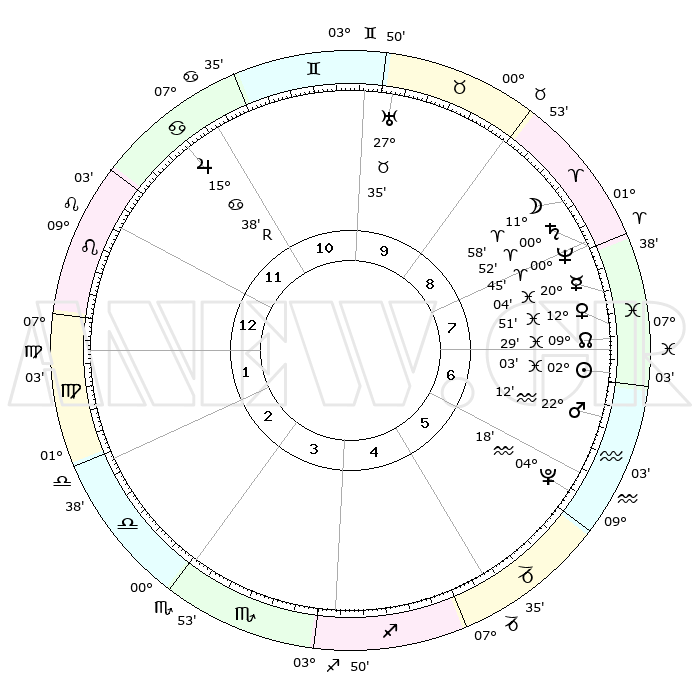 | | ΘΕΣΕΙΣ ΠΛΑΝΗΤΩΝ ΑΣΤΡΟΛΟΓΙΚΟΥ ΧΑΡΤΗ ΤΗΣ ΣΤΙΓΜΗΣ ΑΥΤΗΣ | | | | Πλανήτης | Ζώδιο | Μοίρες | Δεκαήμ. | Σε οίκο | Απόκλιση | | Ακμές των οίκων | | Ηλιος | Ιχθείς | 01°32' | Πρώτο | 1 | 10 S 56 | | 1ος | 09°31' | Υδροχόος | | Σελήνη | Κριός | 04°53' | Πρώτο | 2 | 04 N 04 | | 2ος | 24°51' | Ιχθείς | | Ερμής | Ιχθείς | 19°36' | Δεύτερο | 1 | 02 S 56 | | 3ος | 01°38' | Ταύρος | | Αφροδίτη | Ιχθείς | 12°12' | Δεύτερο | 1 | 08 S 19 | | 4ος | 28°34' | Ταύρος | | Αρης | Υδροχόος | 21°48' | Τρίτο | 1 | 15 S 16 | | 5ος | 20°45' | Δίδυμοι | | Δίας | Καρκίνος | 15°40'R | Δεύτερο | 6 | 22 N 51 | | 6ος | 12°38' | Καρκίνος | | Κρόνος | Κριός | 00°48' | Πρώτο | 2 | 01 S 39 | | 7ος | 09°32' | Λέων | | Ουρανός | Ταύρος | 27°34' | Τρίτο | 3 | 19 N 26 | | 8ος | 24°51' | Παρθένος | | Ποσειδώνας | Κριός | 00°44' | Πρώτο | 2 | 00 S 54 | | 9ος | 01°38' | Σκορπιός | | Πλούτωνας | Υδροχόος | 04°17' | Πρώτο | 12 | 22 S 55 | | 10ος | 28°34' | Σκορπιός | | Β. Δεσμός | Ιχθείς | 09°31' | Πρώτο | 1 | 08 S 00 | | 11ος | 20°45' | Τοξότης | | Ωροσκόπος | Υδροχόος | 09°31' | Πρώτο | | | 12ος | 12°38' | Αιγόκερως | | Μεσουράνημα | Σκορπιός | 28°34' | Τρίτο | | | |