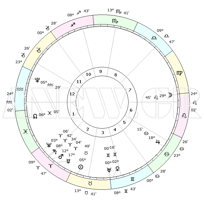 | | ΘΕΣΕΙΣ ΠΛΑΝΗΤΩΝ ΑΣΤΡΟΛΟΓΙΚΟΥ ΧΑΡΤΗ ΤΗΣ ΣΤΙΓΜΗΣ ΑΥΤΗΣ | | | | Πλανήτης | Ζώδιο | Μοίρες | Δεκαήμ. | Σε οίκο | Απόκλιση | | Ακμές των οίκων | | Ηλιος | Ταύρος | 05°45' | Πρώτο | 3 | 13 N 26 | | 1ος | 24°56' | Αιγόκερως | | Σελήνη | Λέων | 28°55' | Τρίτο | 7 | 12 N 33 | | 2ος | 08°07' | Ιχθείς | | Ερμής | Κριός | 16°57' | Δεύτερο | 2 | 04 N 28 | | 3ος | 17°17' | Κριός | | Αφροδίτη | Δίδυμοι | 02°11' | Πρώτο | 4 | 21 N 15 | | 4ος | 16°39' | Ταύρος | | Αρης | Κριός | 12°31' | Δεύτερο | 2 | 04 N 06 | | 5ος | 09°49' | Δίδυμοι | | Δίας | Καρκίνος | 18°14' | Δεύτερο | 6 | 22 N 34 | | 6ος | 01°06' | Καρκίνος | | Κρόνος | Κριός | 08°41' | Πρώτο | 2 | 01 N 27 | | 7ος | 24°56' | Καρκίνος | | Ουρανός | Δίδυμοι | 00°00' | Πρώτο | 4 | 19 N 59 | | 8ος | 08°07' | Παρθένος | | Ποσειδώνας | Κριός | 03°06' | Πρώτο | 2 | 00 N 01 | | 9ος | 17°17' | Ζυγός | | Πλούτωνας | Υδροχόος | 05°29' | Πρώτο | 1 | 22 S 48 | | 10ος | 16°39' | Σκορπιός | | Β. Δεσμός | Ιχθείς | 06°05' | Πρώτο | 1 | 09 S 17 | | 11ος | 09°49' | Τοξότης | | Ωροσκόπος | Αιγόκερως | 24°56' | Τρίτο | | | 12ος | 01°06' | Αιγόκερως | | Μεσουράνημα | Σκορπιός | 16°39' | Δεύτερο | | | |