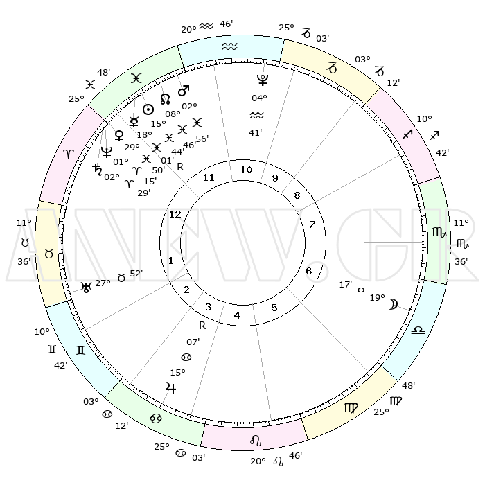 | | ΘΕΣΕΙΣ ΠΛΑΝΗΤΩΝ ΑΣΤΡΟΛΟΓΙΚΟΥ ΧΑΡΤΗ ΤΗΣ ΣΤΙΓΜΗΣ ΑΥΤΗΣ | | | | Πλανήτης | Ζώδιο | Μοίρες | Δεκαήμ. | Σε οίκο | Απόκλιση | | Ακμές των οίκων | | Ηλιος | Ιχθείς | 16°19' | Δεύτερο | 4 | 05 S 24 | | 1ος | 20°14' | Σκορπιός | | Σελήνη | Ζυγός | 26°42' | Τρίτο | 11 | 13 S 56 | | 2ος | 20°12' | Τοξότης | | Ερμής | Ιχθείς | 17°26'R | Δεύτερο | 4 | 01 S 35 | | 3ος | 24°23' | Αιγόκερως | | Αφροδίτη | Κριός | 00°34' | Πρώτο | 4 | 00 S 55 | | 4ος | 00°00' | Ιχθείς | | Αρης | Ιχθείς | 03°24' | Πρώτο | 4 | 11 S 17 | | 5ος | 02°03' | Κριός | | Δίας | Καρκίνος | 15°07'R | Δεύτερο | 8 | 22 N 56 | | 6ος | 28°25' | Κριός | | Κρόνος | Κριός | 02°33' | Πρώτο | 5 | 00 S 56 | | 7ος | 20°14' | Ταύρος | | Ουρανός | Ταύρος | 27°52' | Τρίτο | 7 | 19 N 30 | | 8ος | 20°12' | Δίδυμοι | | Ποσειδώνας | Κριός | 01°16' | Πρώτο | 4 | 00 S 42 | | 9ος | 24°23' | Καρκίνος | | Πλούτωνας | Υδροχόος | 04°41' | Πρώτο | 3 | 22 S 51 | | 10ος | 00°00' | Παρθένος | | Β. Δεσμός | Ιχθείς | 08°44' | Πρώτο | 4 | 08 S 18 | | 11ος | 02°03' | Ζυγός | | Ωροσκόπος | Σκορπιός | 20°14' | Τρίτο | | | 12ος | 28°25' | Ζυγός | | Μεσουράνημα | Παρθένος | 00°00' | Πρώτο | | | |