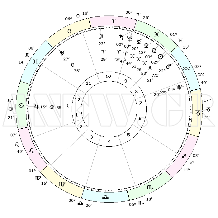 | | ΘΕΣΕΙΣ ΠΛΑΝΗΤΩΝ ΑΣΤΡΟΛΟΓΙΚΟΥ ΧΑΡΤΗ ΤΗΣ ΣΤΙΓΜΗΣ ΑΥΤΗΣ | | | | Πλανήτης | Ζώδιο | Μοίρες | Δεκαήμ. | Σε οίκο | Απόκλιση | | Ακμές των οίκων | | Ηλιος | Ιχθείς | 02°48' | Πρώτο | 10 | 10 S 28 | | 1ος | 23°15' | Δίδυμοι | | Σελήνη | Κριός | 22°26' | Τρίτο | 11 | 12 N 07 | | 2ος | 14°33' | Καρκίνος | | Ερμής | Ιχθείς | 20°41' | Τρίτο | 10 | 02 S 12 | | 3ος | 06°00' | Λέων | | Αφροδίτη | Ιχθείς | 13°47' | Δεύτερο | 10 | 07 S 42 | | 4ος | 01°18' | Παρθένος | | Αρης | Υδροχόος | 22°48' | Τρίτο | 9 | 14 S 57 | | 5ος | 04°04' | Ζυγός | | Δίας | Καρκίνος | 15°36'R | Δεύτερο | 2 | 22 N 51 | | 6ος | 14°22' | Σκορπιός | | Κρόνος | Κριός | 00°57' | Πρώτο | 10 | 01 S 35 | | 7ος | 23°15' | Τοξότης | | Ουρανός | Ταύρος | 27°36' | Τρίτο | 12 | 19 N 26 | | 8ος | 14°33' | Αιγόκερως | | Ποσειδώνας | Κριός | 00°47' | Πρώτο | 10 | 00 S 53 | | 9ος | 06°00' | Υδροχόος | | Πλούτωνας | Υδροχόος | 04°19' | Πρώτο | 8 | 22 S 55 | | 10ος | 01°18' | Ιχθείς | | Β. Δεσμός | Ιχθείς | 09°27' | Πρώτο | 10 | 08 S 02 | | 11ος | 04°04' | Κριός | | Ωροσκόπος | Δίδυμοι | 23°15' | Τρίτο | | | 12ος | 14°22' | Ταύρος | | Μεσουράνημα | Ιχθείς | 01°18' | Πρώτο | | | |