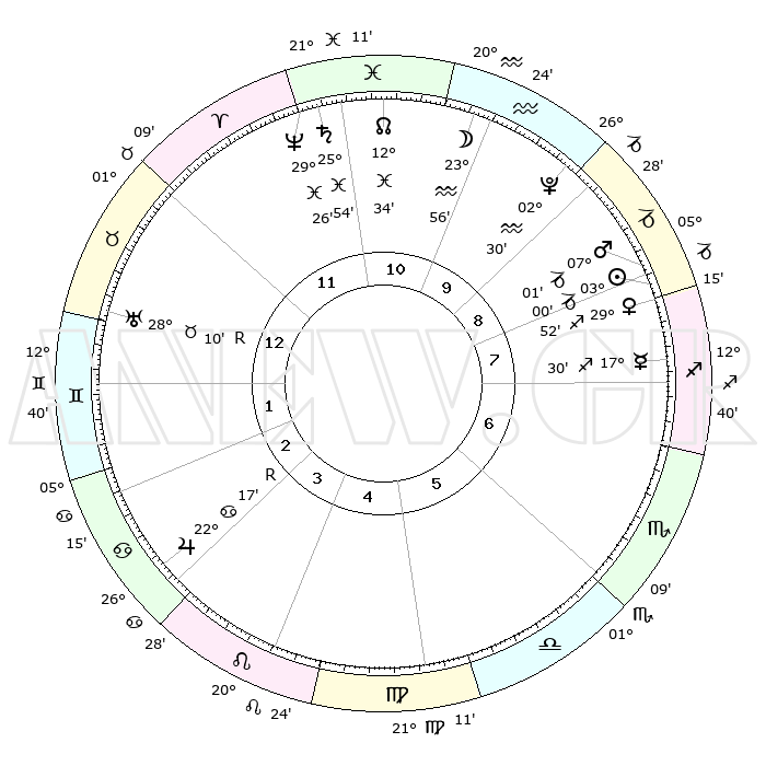 | | ΘΕΣΕΙΣ ΠΛΑΝΗΤΩΝ ΑΣΤΡΟΛΟΓΙΚΟΥ ΧΑΡΤΗ ΤΗΣ ΣΤΙΓΜΗΣ ΑΥΤΗΣ | | | | Πλανήτης | Ζώδιο | Μοίρες | Δεκαήμ. | Σε οίκο | Απόκλιση | | Ακμές των οίκων | | Ηλιος | Αιγόκερως | 02°55' | Πρώτο | 9 | 23 S 24 | | 1ος | 09°29' | Ταύρος | | Σελήνη | Υδροχόος | 22°58' | Τρίτο | 11 | 15 S 22 | | 2ος | 09°08' | Δίδυμοι | | Ερμής | Τοξότης | 17°24' | Δεύτερο | 8 | 22 S 31 | | 3ος | 01°48' | Καρκίνος | | Αφροδίτη | Τοξότης | 29°46' | Τρίτο | 8 | 23 S 39 | | 4ος | 23°37' | Καρκίνος | | Αρης | Αιγόκερως | 06°58' | Πρώτο | 9 | 24 S 05 | | 5ος | 19°03' | Λέων | | Δίας | Καρκίνος | 22°18'R | Τρίτο | 3 | 21 N 48 | | 6ος | 23°40' | Παρθένος | | Κρόνος | Ιχθείς | 25°54' | Τρίτο | 12 | 03 S 44 | | 7ος | 09°29' | Σκορπιός | | Ουρανός | Ταύρος | 28°10'R | Τρίτο | 1 | 19 N 33 | | 8ος | 09°08' | Τοξότης | | Ποσειδώνας | Ιχθείς | 29°26' | Τρίτο | 12 | 01 S 27 | | 9ος | 01°48' | Αιγόκερως | | Πλούτωνας | Υδροχόος | 02°30' | Πρώτο | 10 | 23 S 16 | | 10ος | 23°37' | Αιγόκερως | | Β. Δεσμός | Ιχθείς | 12°34' | Δεύτερο | 11 | 06 S 51 | | 11ος | 19°03' | Υδροχόος | | Ωροσκόπος | Ταύρος | 09°29' | Πρώτο | | | 12ος | 23°40' | Ιχθείς | | Μεσουράνημα | Αιγόκερως | 23°37' | Τρίτο | | | |