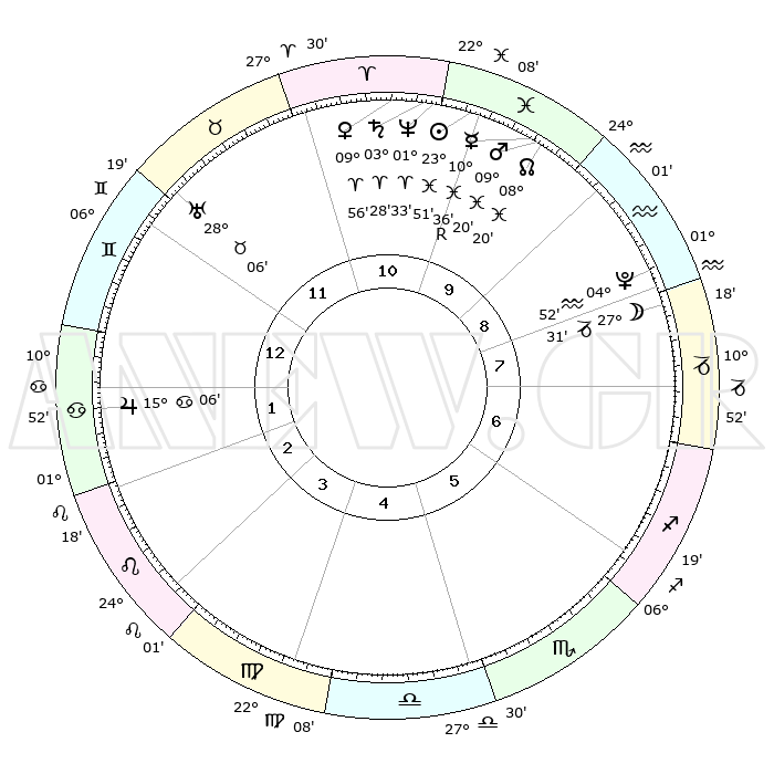 | | ΘΕΣΕΙΣ ΠΛΑΝΗΤΩΝ ΑΣΤΡΟΛΟΓΙΚΟΥ ΧΑΡΤΗ ΤΗΣ ΣΤΙΓΜΗΣ ΑΥΤΗΣ | | | | Πλανήτης | Ζώδιο | Μοίρες | Δεκαήμ. | Σε οίκο | Απόκλιση | | Ακμές των οίκων | | Ηλιος | Ιχθείς | 23°48' | Τρίτο | 10 | 02 S 28 | | 1ος | 23°37' | Δίδυμοι | | Σελήνη | Αιγόκερως | 26°52' | Τρίτο | 8 | 24 S 15 | | 2ος | 14°54' | Καρκίνος | | Ερμής | Ιχθείς | 10°38'R | Δεύτερο | 10 | 05 S 13 | | 3ος | 06°22' | Λέων | | Αφροδίτη | Κριός | 09°52' | Πρώτο | 11 | 02 N 56 | | 4ος | 01°42' | Παρθένος | | Αρης | Ιχθείς | 09°18' | Πρώτο | 10 | 09 S 05 | | 5ος | 04°33' | Ζυγός | | Δίας | Καρκίνος | 15°06' | Δεύτερο | 2 | 22 N 56 | | 6ος | 14°51' | Σκορπιός | | Κρόνος | Κριός | 03°28' | Πρώτο | 10 | 00 S 34 | | 7ος | 23°37' | Τοξότης | | Ουρανός | Ταύρος | 28°06' | Τρίτο | 12 | 19 N 33 | | 8ος | 14°54' | Αιγόκερως | | Ποσειδώνας | Κριός | 01°33' | Πρώτο | 10 | 00 S 35 | | 9ος | 06°22' | Υδροχόος | | Πλούτωνας | Υδροχόος | 04°52' | Πρώτο | 8 | 22 S 50 | | 10ος | 01°42' | Ιχθείς | | Β. Δεσμός | Ιχθείς | 08°20' | Πρώτο | 10 | 08 S 27 | | 11ος | 04°33' | Κριός | | Ωροσκόπος | Δίδυμοι | 23°37' | Τρίτο | | | 12ος | 14°51' | Ταύρος | | Μεσουράνημα | Ιχθείς | 01°42' | Πρώτο | | | |