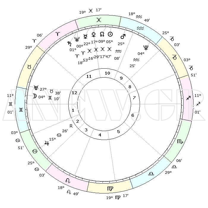 | | ΘΕΣΕΙΣ ΠΛΑΝΗΤΩΝ ΑΣΤΡΟΛΟΓΙΚΟΥ ΧΑΡΤΗ ΤΗΣ ΣΤΙΓΜΗΣ ΑΥΤΗΣ | | | | Πλανήτης | Ζώδιο | Μοίρες | Δεκαήμ. | Σε οίκο | Απόκλιση | | Ακμές των οίκων | | Ηλιος | Ιχθείς | 05°44' | Πρώτο | 11 | 09 S 24 | | 1ος | 16°54' | Ταύρος | | Σελήνη | Δίδυμοι | 03°23' | Πρώτο | 1 | 25 N 59 | | 2ος | 14°40' | Δίδυμοι | | Ερμής | Ιχθείς | 22°15' | Τρίτο | 11 | 00 S 55 | | 3ος | 06°46' | Καρκίνος | | Αφροδίτη | Ιχθείς | 17°25' | Δεύτερο | 11 | 06 S 17 | | 4ος | 28°48' | Καρκίνος | | Αρης | Υδροχόος | 25°05' | Τρίτο | 10 | 14 S 11 | | 5ος | 25°13' | Λέων | | Δίας | Καρκίνος | 15°26'R | Δεύτερο | 3 | 22 N 53 | | 6ος | 01°18' | Ζυγός | | Κρόνος | Κριός | 01°17' | Πρώτο | 11 | 01 S 27 | | 7ος | 16°54' | Σκορπιός | | Ουρανός | Ταύρος | 27°38' | Τρίτο | 1 | 19 N 27 | | 8ος | 14°40' | Τοξότης | | Ποσειδώνας | Κριός | 00°53' | Πρώτο | 11 | 00 S 51 | | 9ος | 06°46' | Αιγόκερως | | Πλούτωνας | Υδροχόος | 04°24' | Πρώτο | 10 | 22 S 54 | | 10ος | 28°48' | Αιγόκερως | | Β. Δεσμός | Ιχθείς | 09°18' | Πρώτο | 11 | 08 S 05 | | 11ος | 25°13' | Υδροχόος | | Ωροσκόπος | Ταύρος | 16°54' | Δεύτερο | | | 12ος | 01°18' | Κριός | | Μεσουράνημα | Αιγόκερως | 28°48' | Τρίτο | | | |