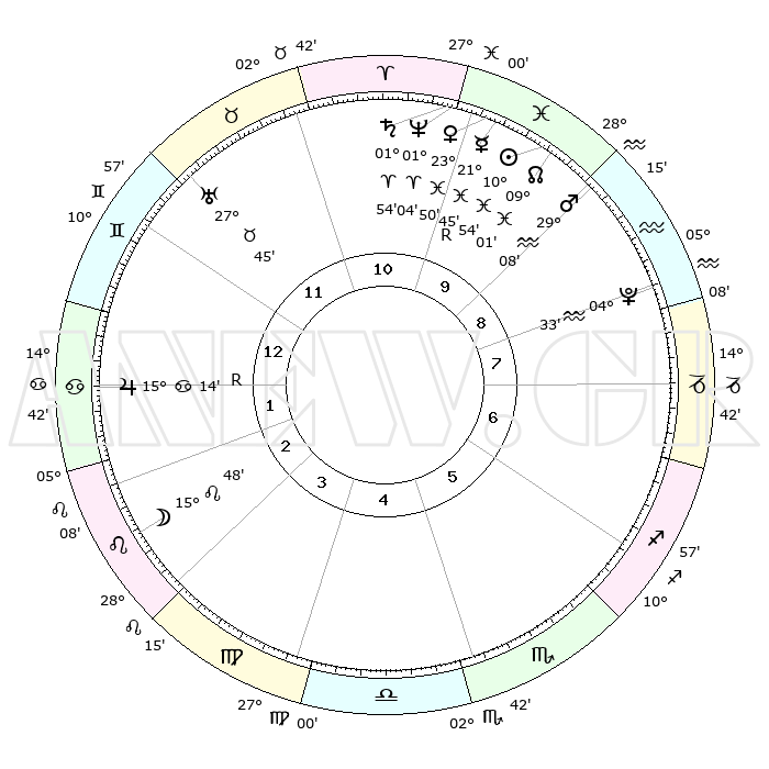 | | ΘΕΣΕΙΣ ΠΛΑΝΗΤΩΝ ΑΣΤΡΟΛΟΓΙΚΟΥ ΧΑΡΤΗ ΤΗΣ ΣΤΙΓΜΗΣ ΑΥΤΗΣ | | | | Πλανήτης | Ζώδιο | Μοίρες | Δεκαήμ. | Σε οίκο | Απόκλιση | | Ακμές των οίκων | | Ηλιος | Ιχθείς | 10°51' | Δεύτερο | 10 | 07 S 30 | | 1ος | 28°06' | Δίδυμοι | | Σελήνη | Λέων | 15°05' | Δεύτερο | 3 | 18 N 21 | | 2ος | 19°01' | Καρκίνος | | Ερμής | Ιχθείς | 21°47'R | Τρίτο | 10 | 00 S 10 | | 3ος | 10°42' | Λέων | | Αφροδίτη | Ιχθείς | 23°46' | Τρίτο | 10 | 03 S 43 | | 4ος | 06°43' | Παρθένος | | Αρης | Υδροχόος | 29°06' | Τρίτο | 9 | 12 S 49 | | 5ος | 10°20' | Ζυγός | | Δίας | Καρκίνος | 15°14'R | Δεύτερο | 1 | 22 N 54 | | 6ος | 20°28' | Σκορπιός | | Κρόνος | Κριός | 01°53' | Πρώτο | 10 | 01 S 12 | | 7ος | 28°06' | Τοξότης | | Ουρανός | Ταύρος | 27°45' | Τρίτο | 12 | 19 N 29 | | 8ος | 19°01' | Αιγόκερως | | Ποσειδώνας | Κριός | 01°04' | Πρώτο | 10 | 00 S 47 | | 9ος | 10°42' | Υδροχόος | | Πλούτωνας | Υδροχόος | 04°33' | Πρώτο | 8 | 22 S 52 | | 10ος | 06°43' | Ιχθείς | | Β. Δεσμός | Ιχθείς | 09°01' | Πρώτο | 10 | 08 S 11 | | 11ος | 10°20' | Κριός | | Ωροσκόπος | Δίδυμοι | 28°06' | Τρίτο | | | 12ος | 20°28' | Ταύρος | | Μεσουράνημα | Ιχθείς | 06°43' | Πρώτο | | | |